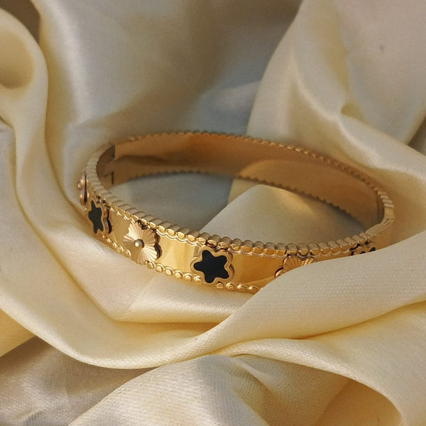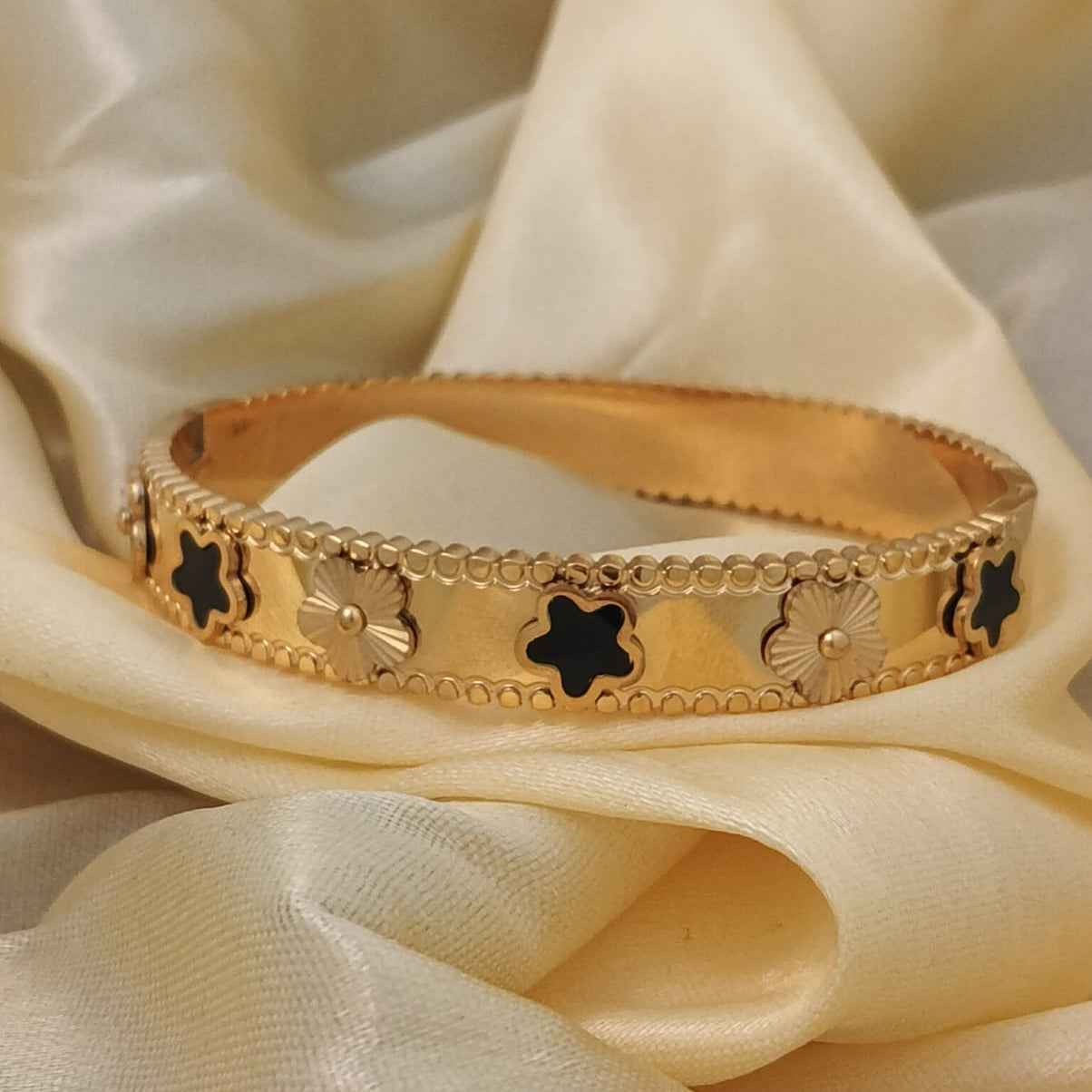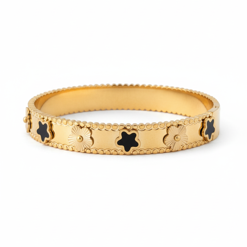 Elevate your everyday style with this exquisite gold bracelet featuring alternating black clover motifs and textured floral accents. Designed with a sleek polished finish and a beaded edge, it blends modern elegance with timeless charm. Lightweight, durable, and eye-catching, this piece instantly adds sophistication to any outfit — whether you're dressing up for a special occasion or accessorizing your daily look.