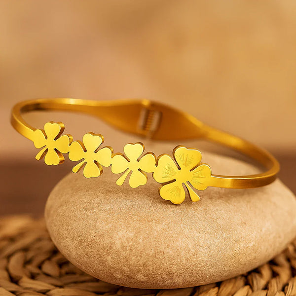 Bring a touch of charm and sophistication to your look with this beautifully crafted flower design bracelet. Made from durable stainless steel and finished with luxurious 18K gold plating, it blends timeless elegance with modern durability. Its floral motif adds a delicate feminine touch, while the free-size fit ensures comfort and versatility for everyday wear or special occasions.