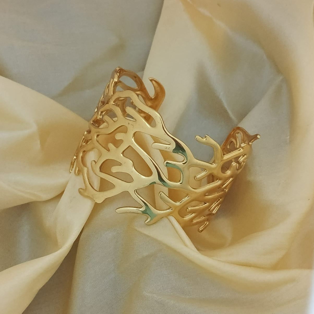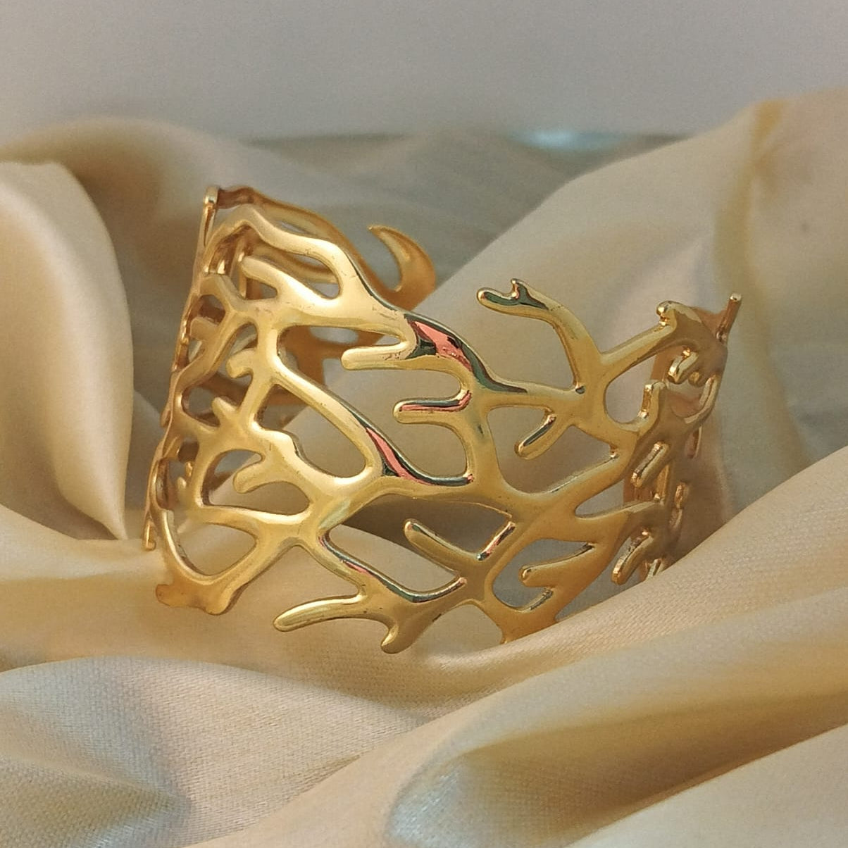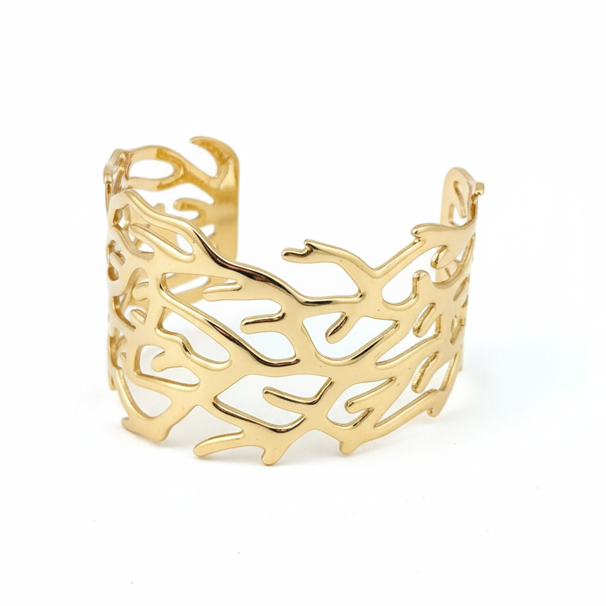 It is a cuff design, meaning it has an opening at the back for easy wear, and is designed to sit comfortably on the wrist. Its substantial width makes it a fashion-forward statement piece, perfect for elevating both casual and formal attire.