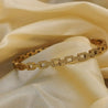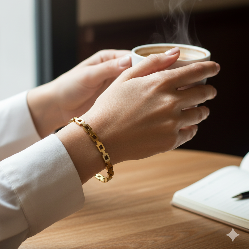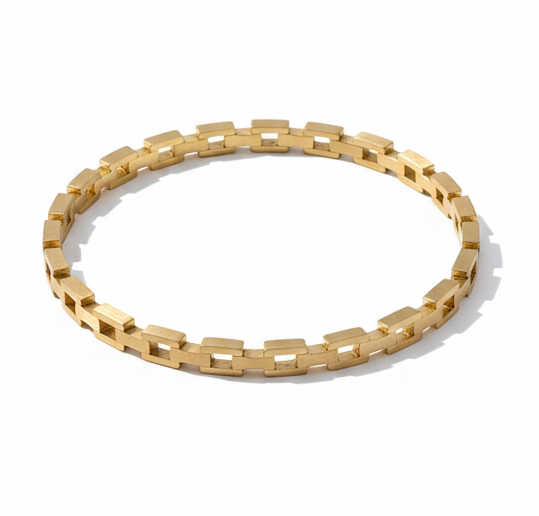 This striking piece is a celebration of bold, architectural design and luxurious craftsmanship. The bangle features a continuous, interlocking pattern of rectangular links, giving it a modern and sophisticated chain-like structure.