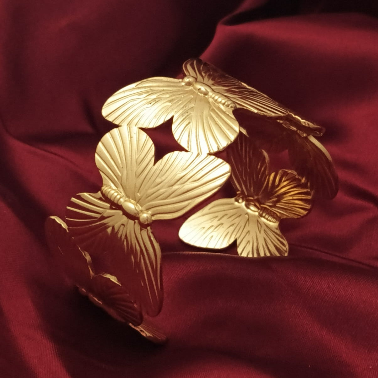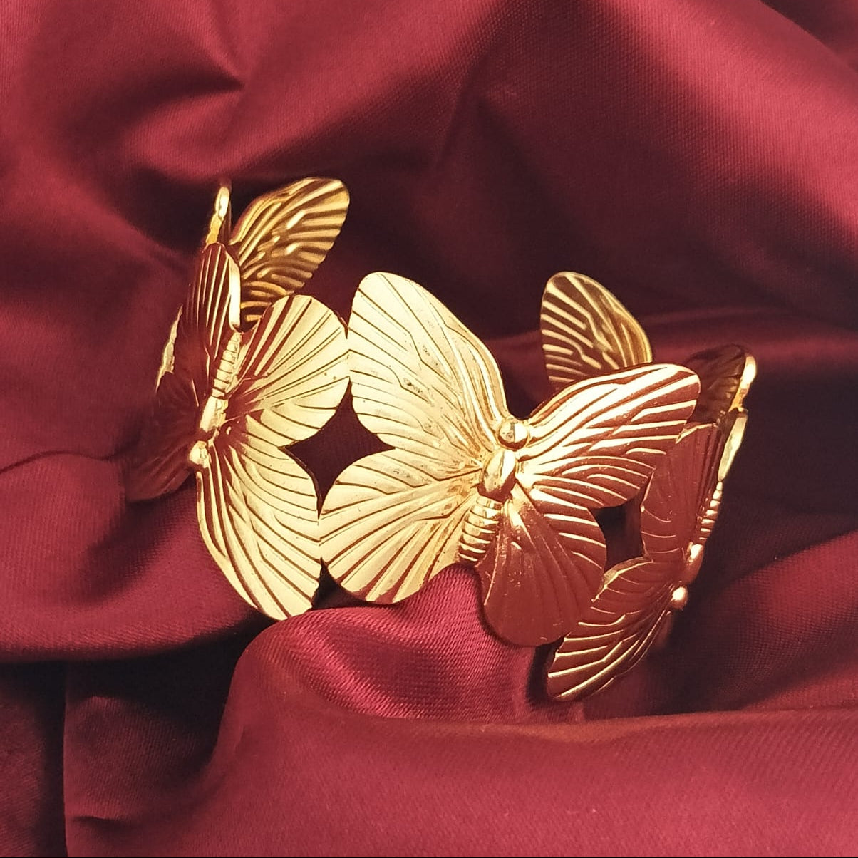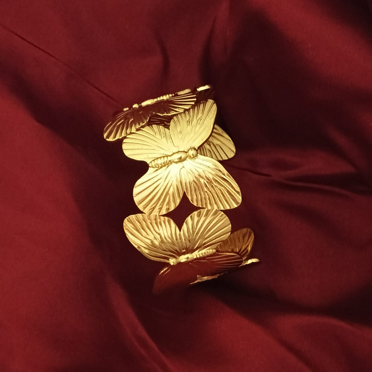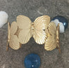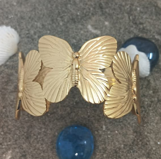 This eye-catching piece features a continuous ring of intricately detailed golden butterflies; their wings spread in elegant relief. The brushed texture on the wings catches the light beautifully, giving the cuff a sophisticated, high-end finish.