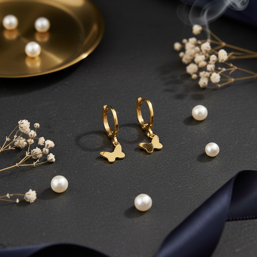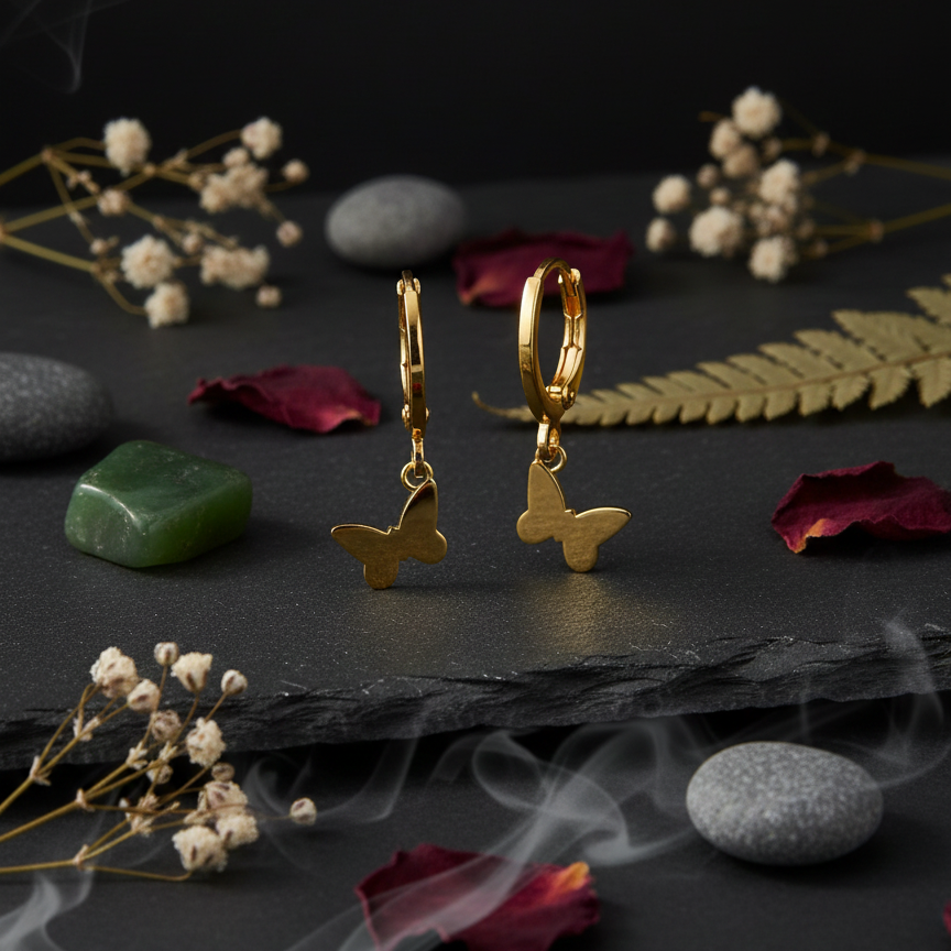 Designed to capture the delicate elegance of nature, the shimmering butterfly charms hang gracefully from polished hoops, catching the light with every movement.