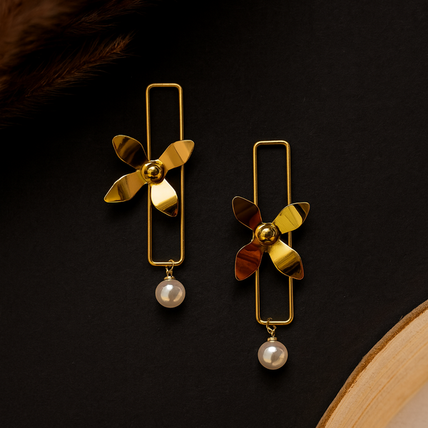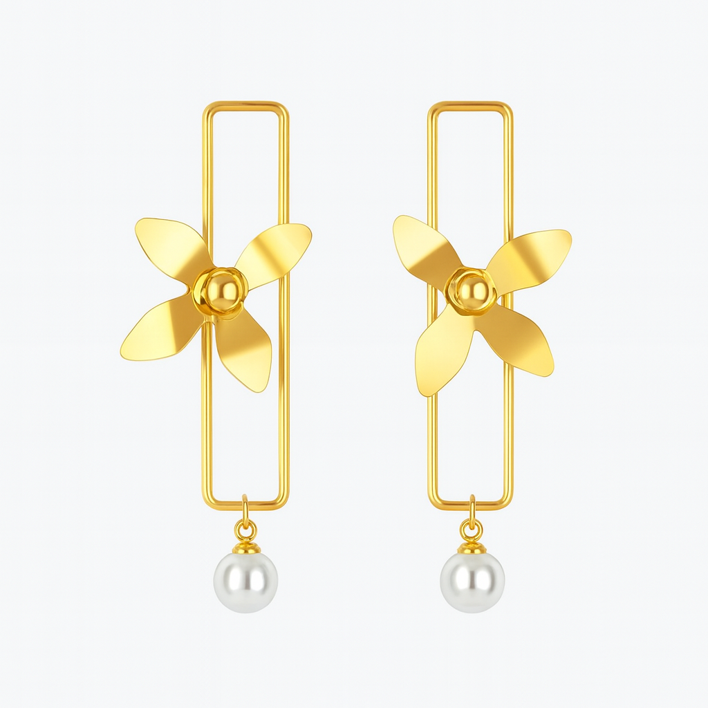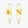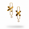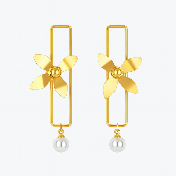 These elegant drop earrings feature a captivating golden flower bloom suspended within a sleek, rectangular frame. A delicate white pearl hangs below, adding a touch of classic sophistication. Perfect for elevating your style from day to evening.