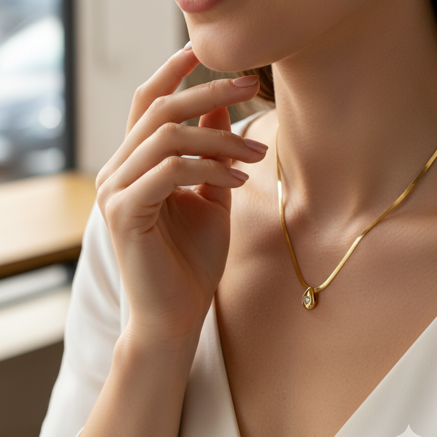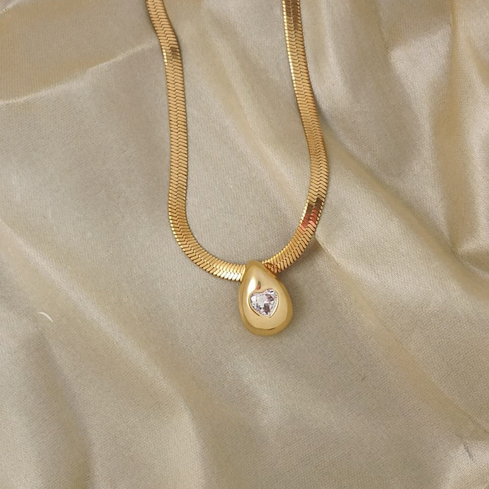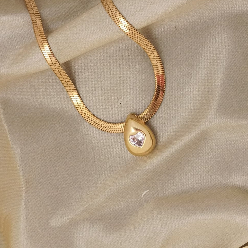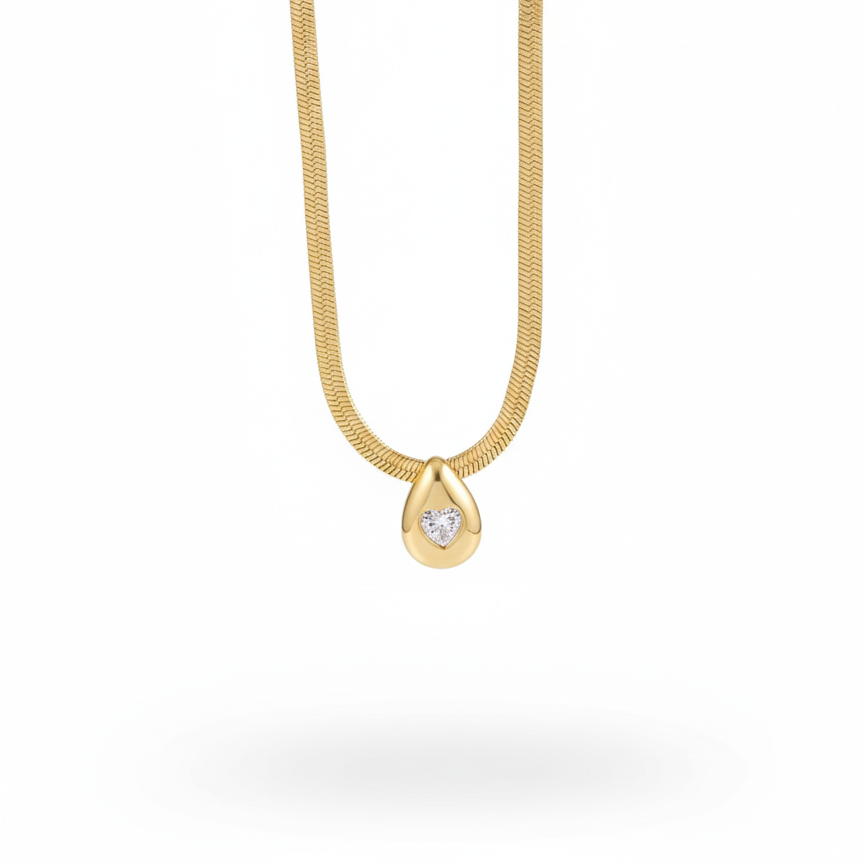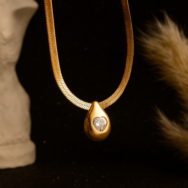 Elevate your everyday look with the Celeste Drop Pendant. Featuring a minimalist teardrop design and a subtle, shimmering heart-cut accent, this piece is crafted to catch the light beautifully. Its sleek, flat-link chain adds a modern yet timeless touch, making it perfect for layering or wearing solo.