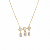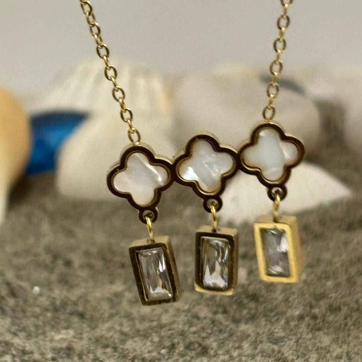 This exquisite necklace features a delicate gold-toned chain supporting a charming trio of clover-inspired motifs, each inlaid with luminous mother-of-pearl. Dangling beneath are three sparkling, baguette-cut cubic zirconia crystals, adding a touch of timeless sophistication and captivating brilliance. Perfect for adding refined elegance to any look.
