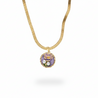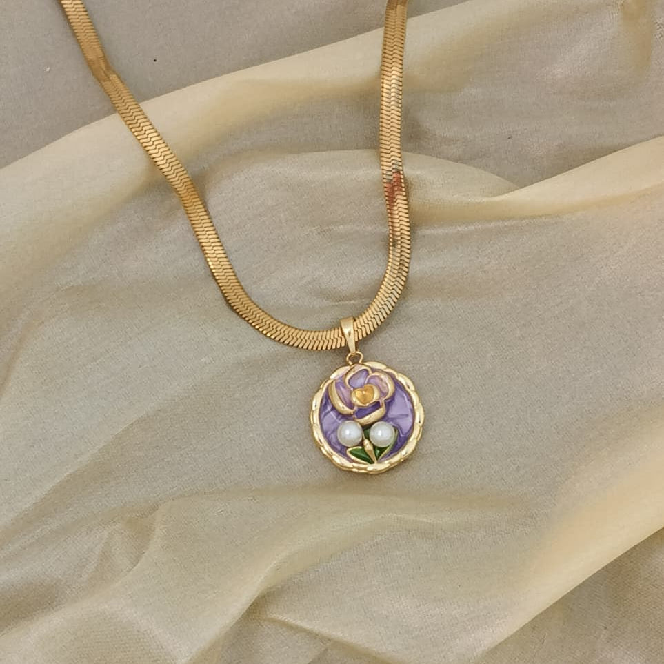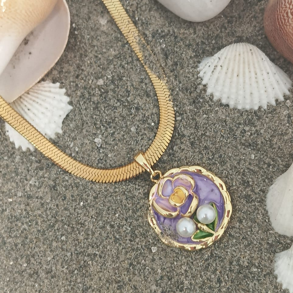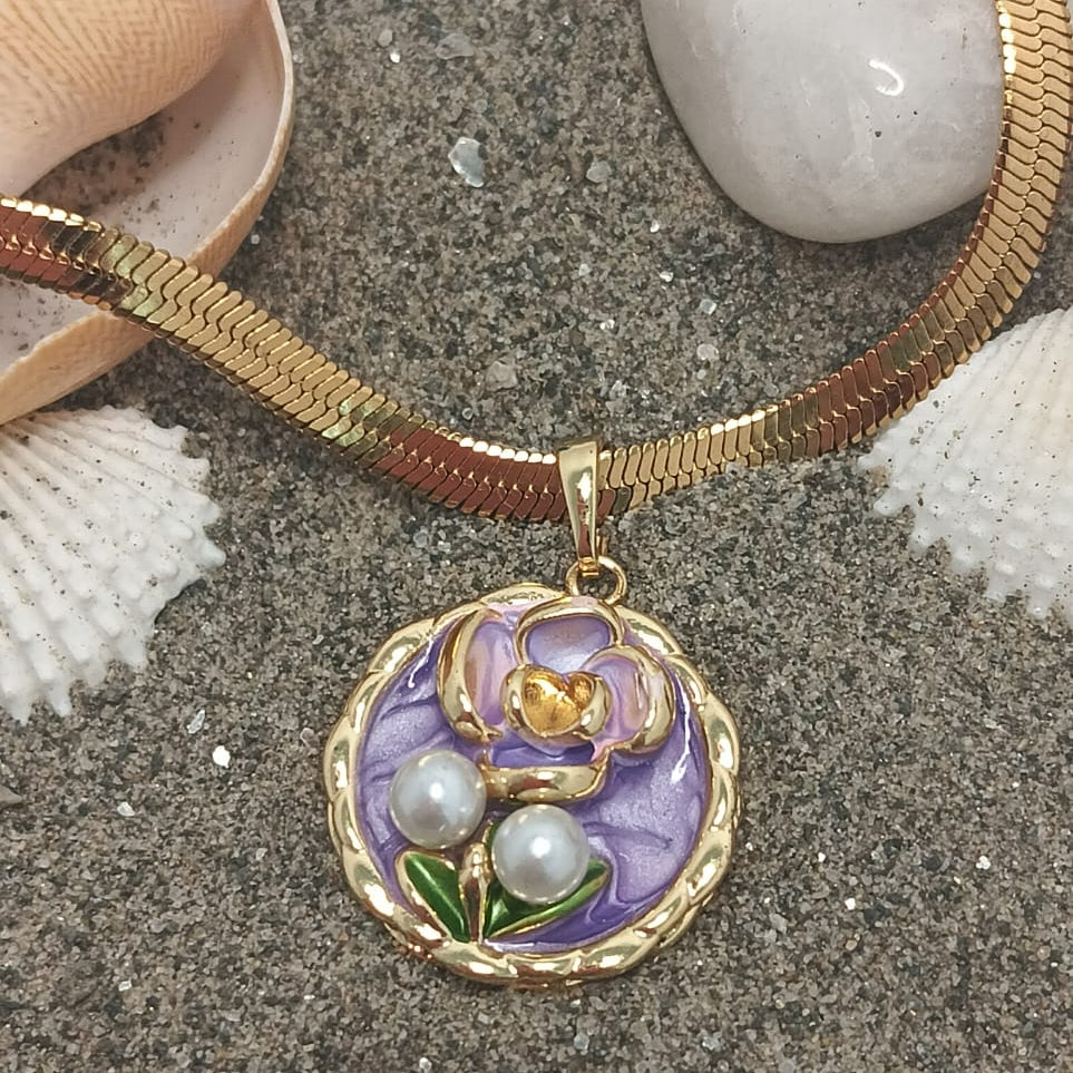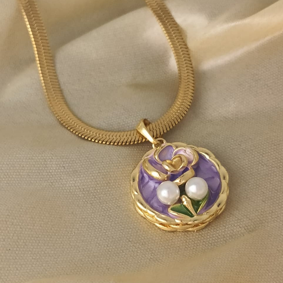 A delicate golden necklace featuring a circular pendant of richly detailed purple enamel, shaped into a captivating floral design. Adorned with two luminous freshwater pearls, this piece evokes a sense of vintage romance and refined elegance, perfect for adding a subtle pop of color and luxury to any outfit.
