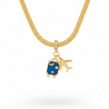 This elegant travel-inspired pendant features a gold-toned airplane charm paired with a blue enamel suitcase, symbolizing wanderlust and adventure. Set on a sleek gold snake chain with sparkling crystal accents, this piece adds a playful yet chic touch to your look. Perfect for travel lovers and dreamers who carry their adventures close to heart.
