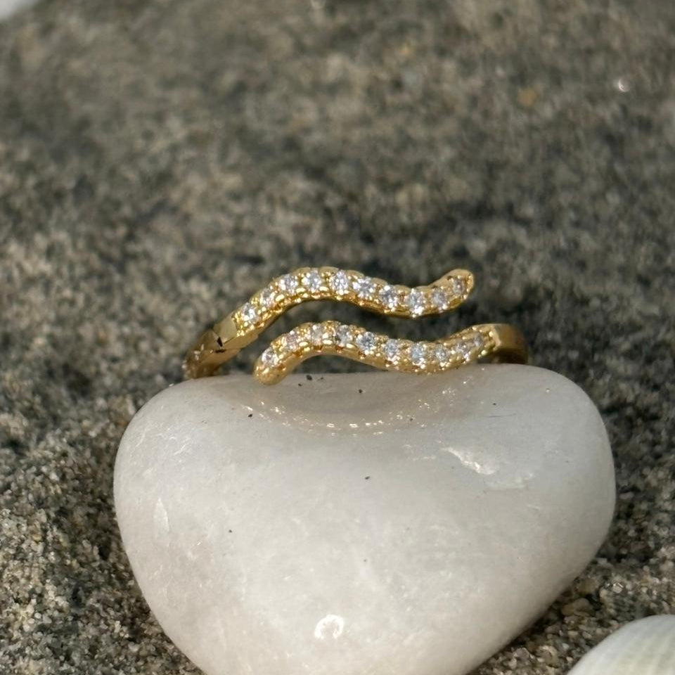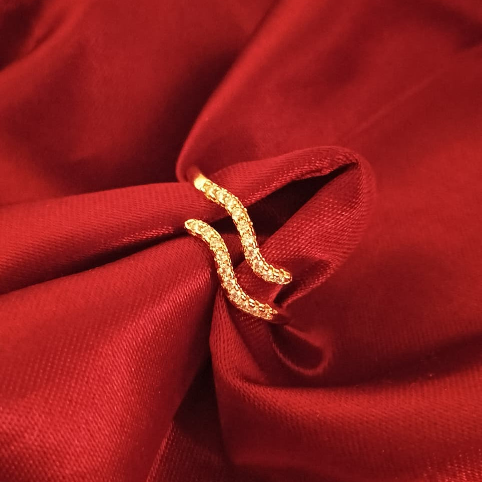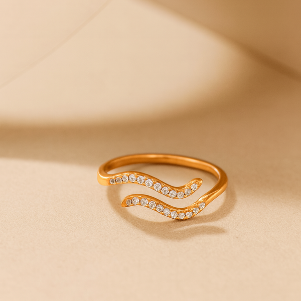 A graceful, open-ended ring crafted in brilliant gold, featuring twin wave-shaped bands lined with sparkling AD Stones. Its fluid silhouette adds a touch of modern elegance, perfect for elevating everyday style or pairing with your favorite statement pieces.