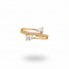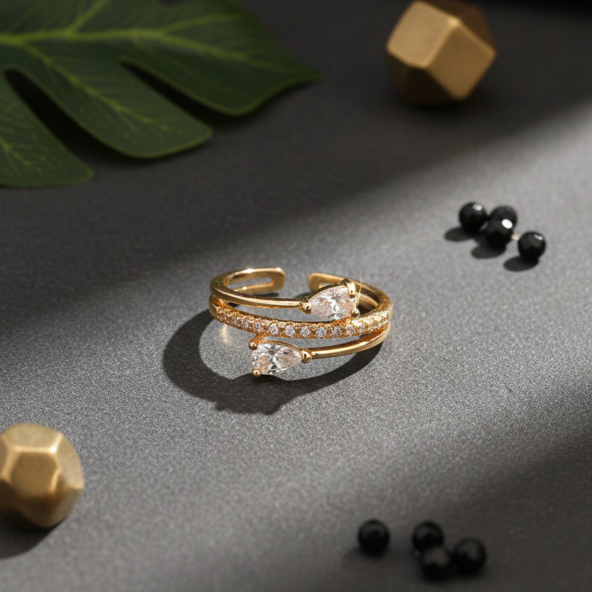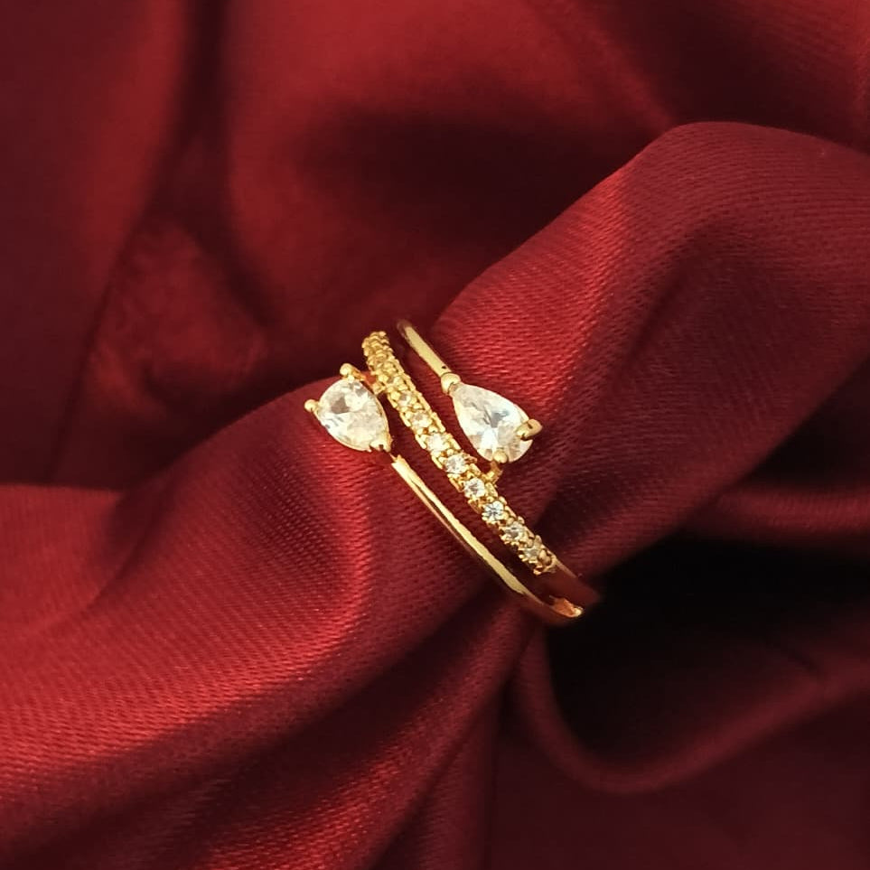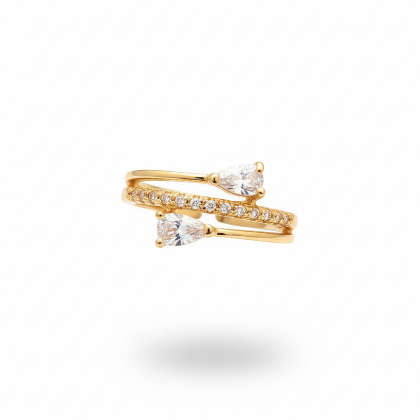A graceful gold-tone bypass ring featuring two shimmering pear-cut stones and a delicate line of CZ sparkle.