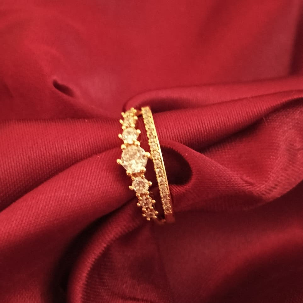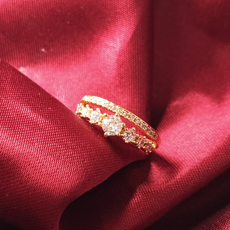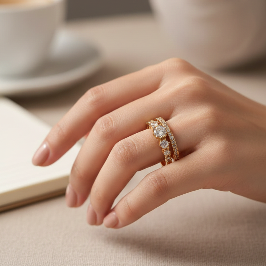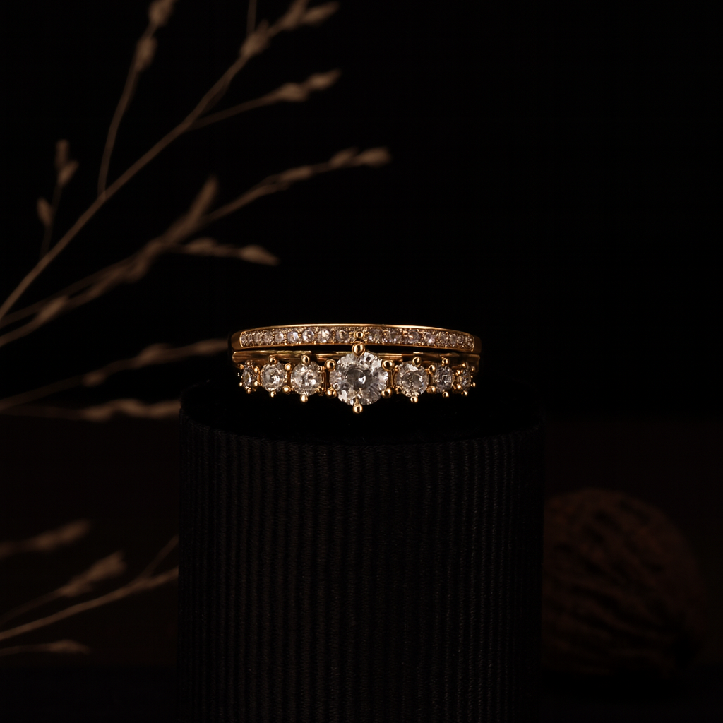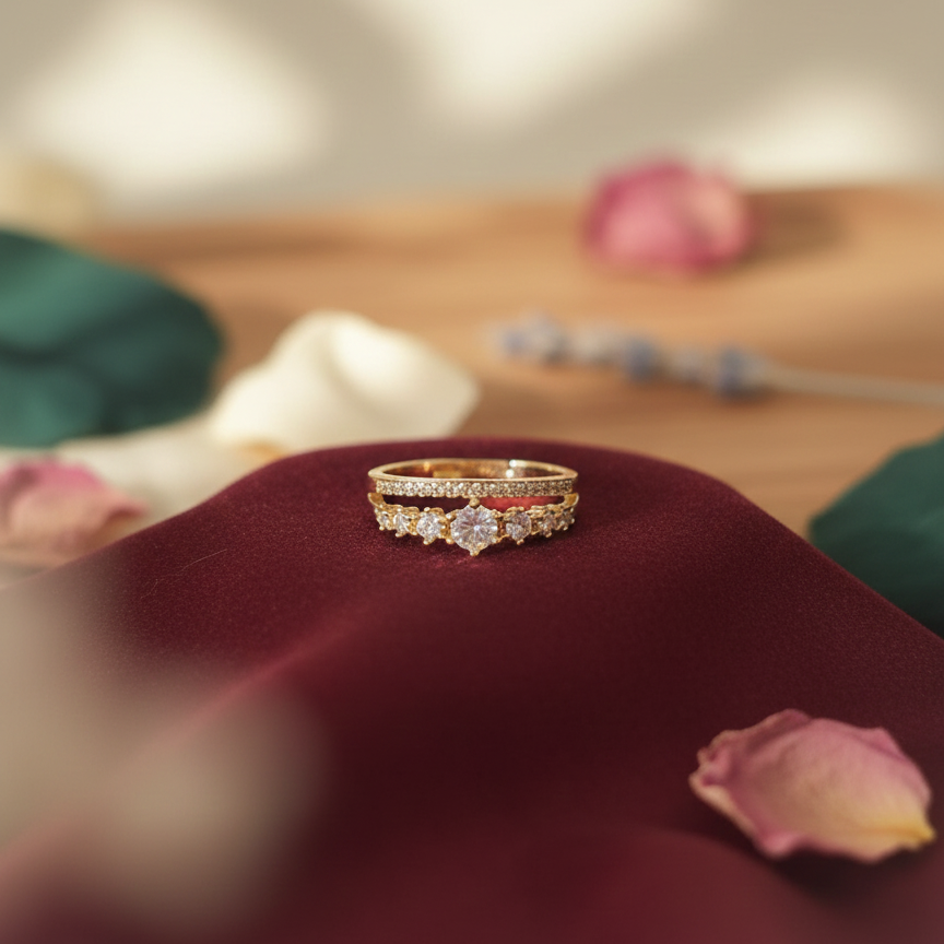 The centerpiece is a band adorned with five brilliant-cut diamonds, perfectly complemented by a second, pave-set diamond band. The warm, soft lighting and scattered rose petals create a romantic, luxurious aesthetic, highlighting the timeless elegance and captivating sparkle of the jewelry.