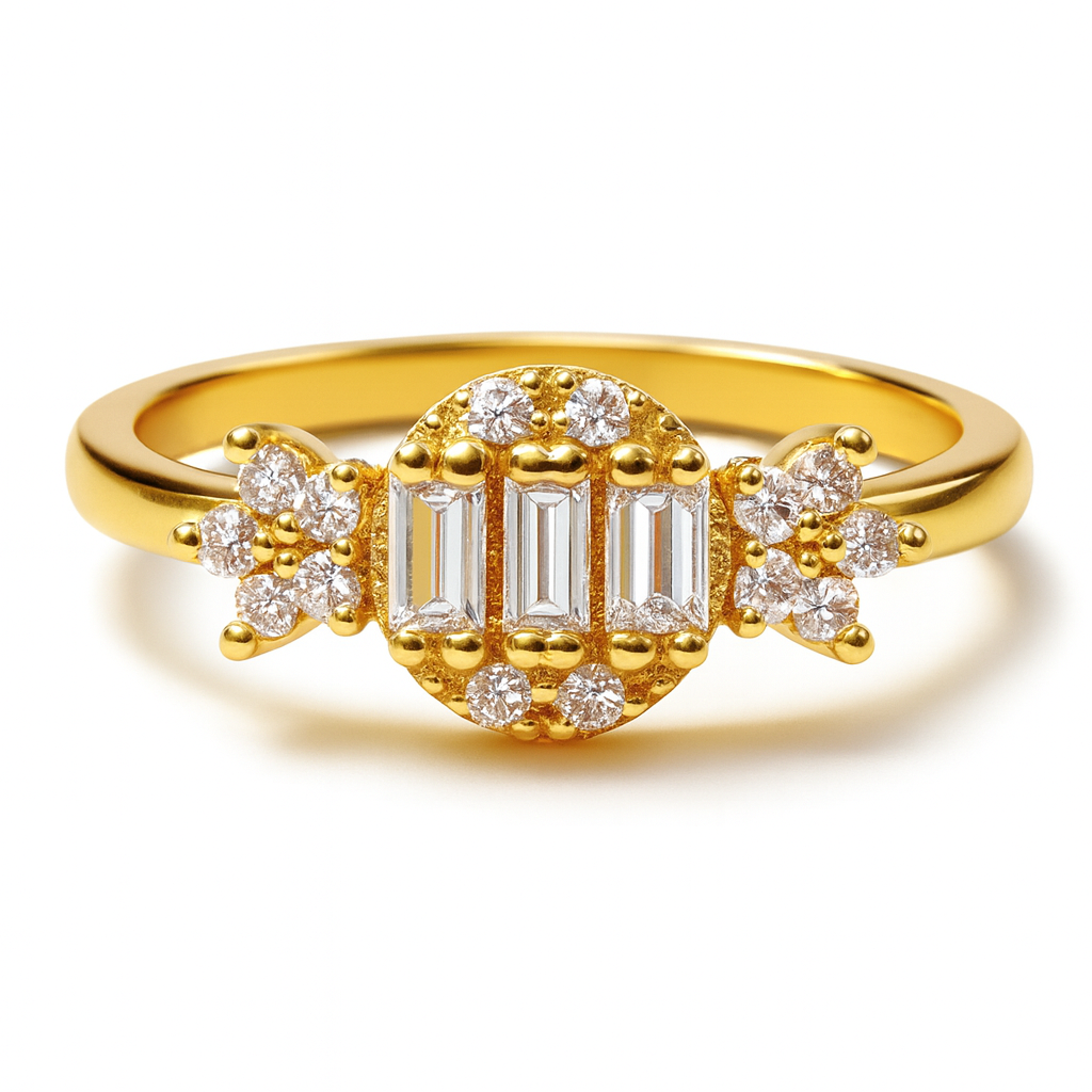 A stunning blend of modern geometry and delicate sparkle, this ring features three sleek baguette stones framed by clusters of shimmering crystals. Set in a rich gold finish, it brings a refined elegance to everyday wear—perfect for adding a graceful, premium touch to any look.