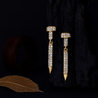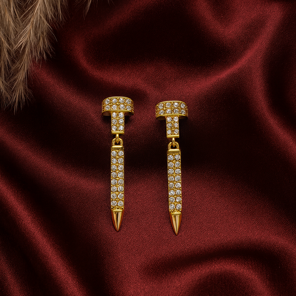These stunning nail-inspired gold drop earrings redefine modern elegance. Crafted with precision, each piece is encrusted with shimmering AD stones that sparkle beautifully against the golden finish. The sleek nail-shaped bar adds an edgy twist to classic glam — making them perfect for festive celebrations, cocktail nights, or a bold office statement.