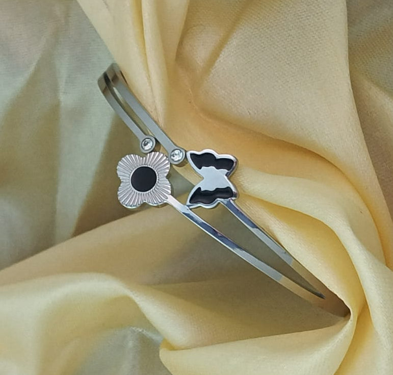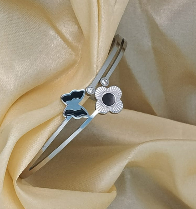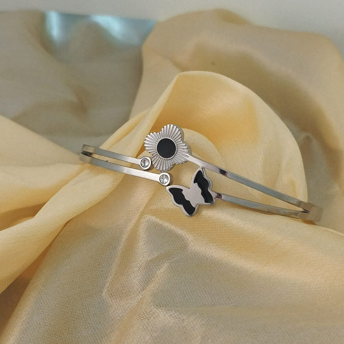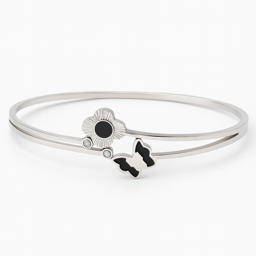 Elegant, modern, and beautifully detailed — the Bloom & Flutter Silver Bracelet brings together a chic black-accent butterfly and a delicate floral charm, creating the perfect balance of playfulness and sophistication.
