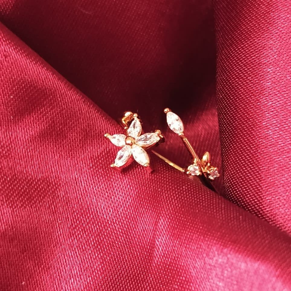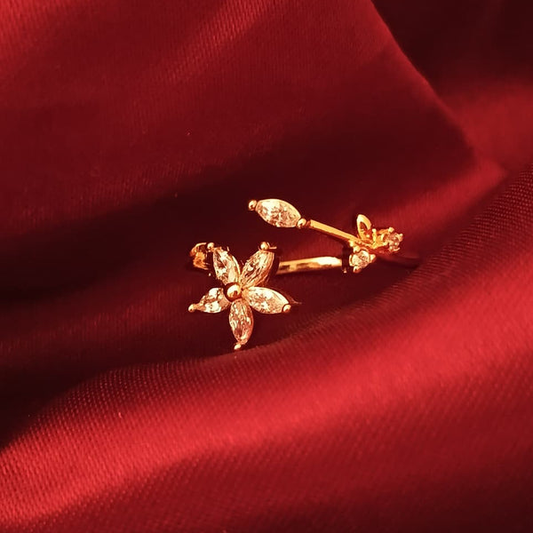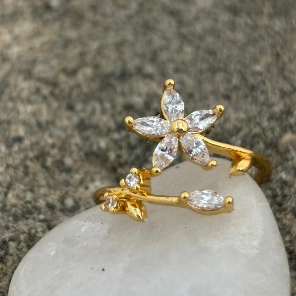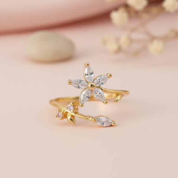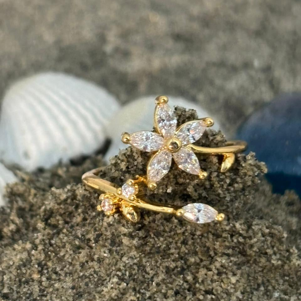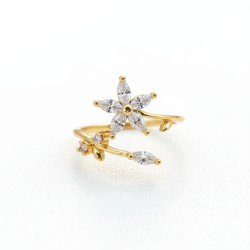 A delicate gold-toned open ring featuring marquise-cut crystals arranged in a radiant floral motif. Its graceful wrap design and sparkling stone accents make it a timeless piece—perfect for everyday elegance or a refined festive look.