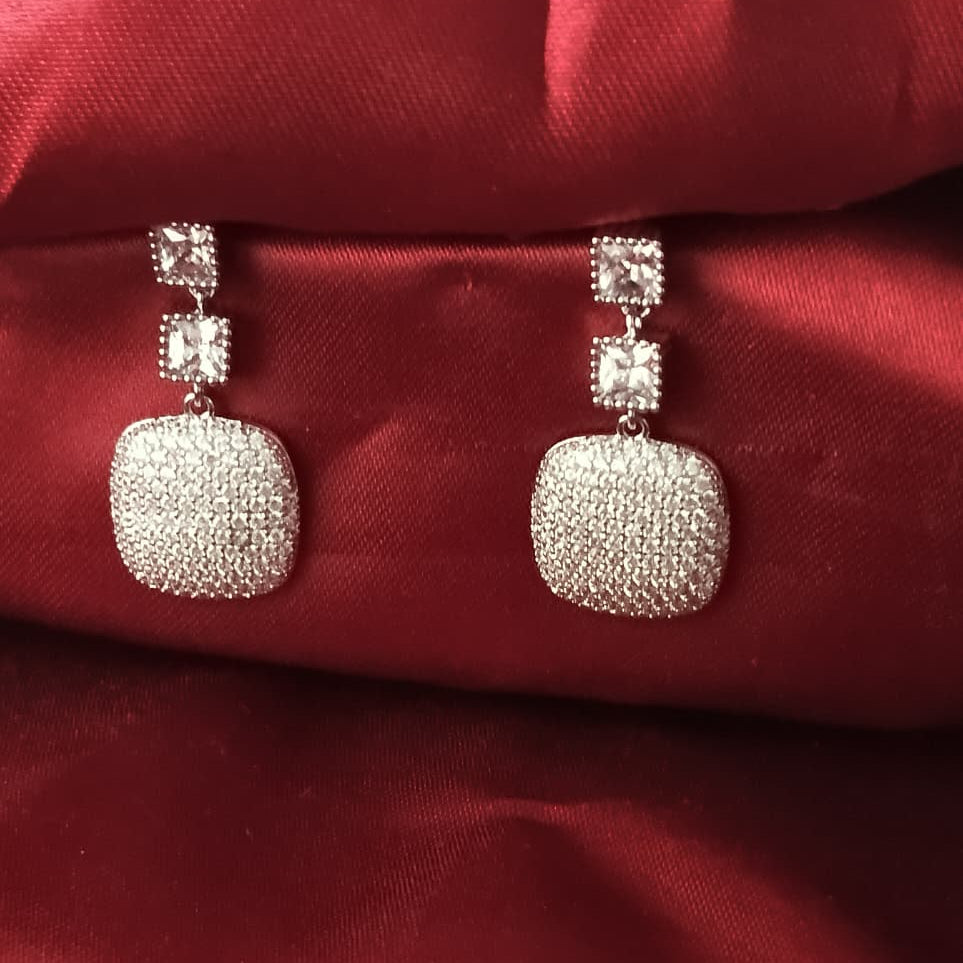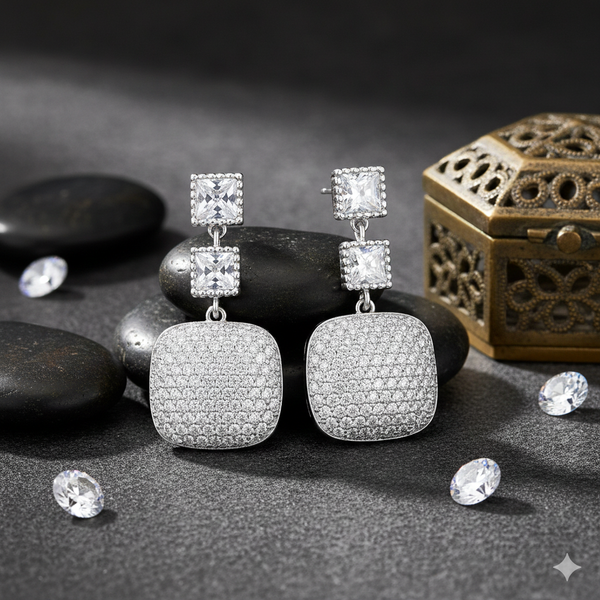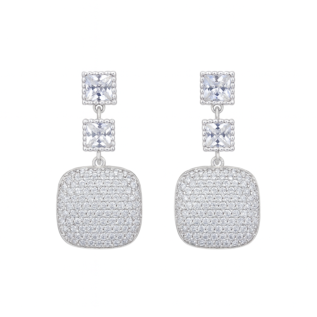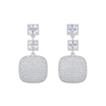 With two square-cut stones leading down to a pavé-encrusted cushion drop, they offer maximum sparkle and an elegant, timeless silhouette. Perfect for adding a touch of glamour to any formal event or evening look.