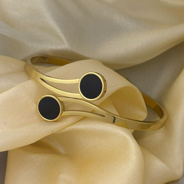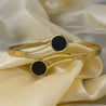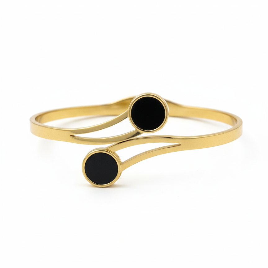 This striking piece features a polished gold coil design that elegantly wraps around the wrist. It is accented with two contrasting, deep black circular inlays, giving it a modern and sophisticated appeal. Perfect for both everyday wear and evening occasions, this bracelet is a timeless accessory.