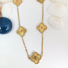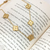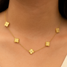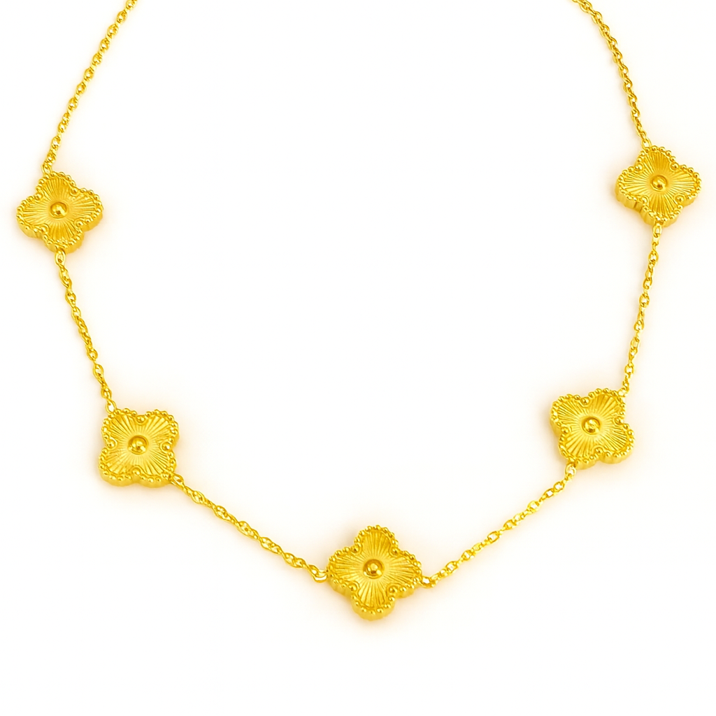 This elegant gold-toned necklace features delicately crafted floral motifs linked together on a fine chain. Each charm showcases intricate detailing, adding a touch of sophistication and timeless beauty. Perfect for both festive occasions and everyday elegance, this piece effortlessly elevates any outfit with its graceful charm.