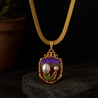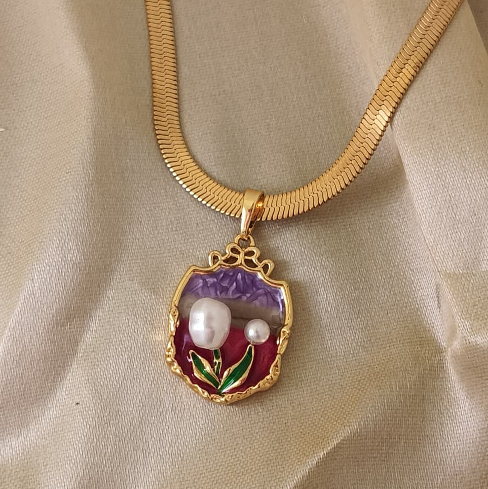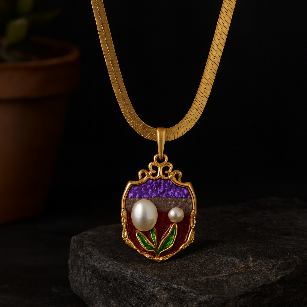 A charming blend of sophistication and artistry, this pendant showcases a blooming floral design with dual pearls set against a rich enamel backdrop of maroon and lavender hues. The green enamel leaves and ornate gold frame add a luxurious touch, making it perfect for elevating both ethnic and modern looks.