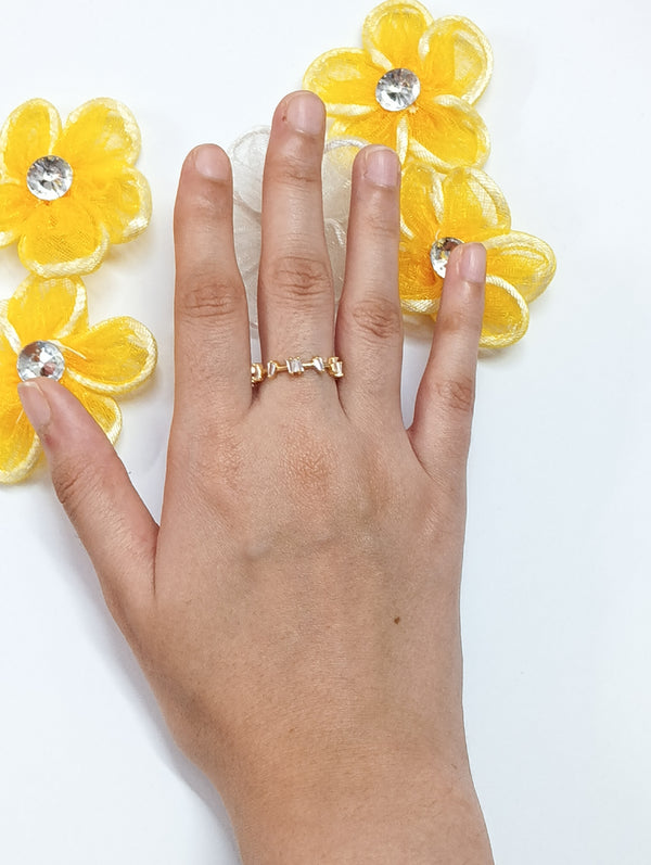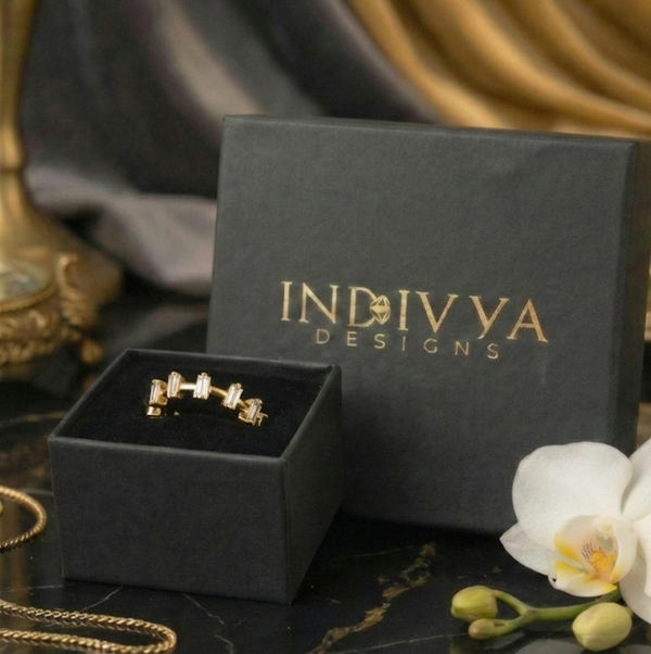 Add a touch of luxury to your look with this stunning gold-plated ring embellished with Cubic Zirconia. The sleek baguette-cut stones shimmer beautifully, making it a perfect pick for both everyday wear and special occasions. Crafted with precision, this anti-tarnish, skin-friendly ring offers timeless elegance and effortless sparkle. Pair it with matching earrings or bangles for a complete look.