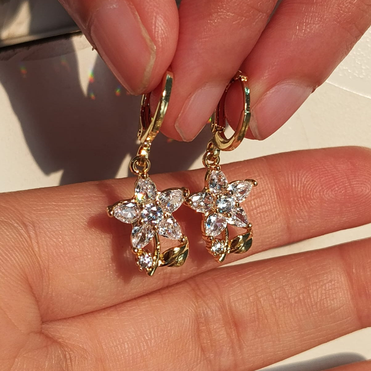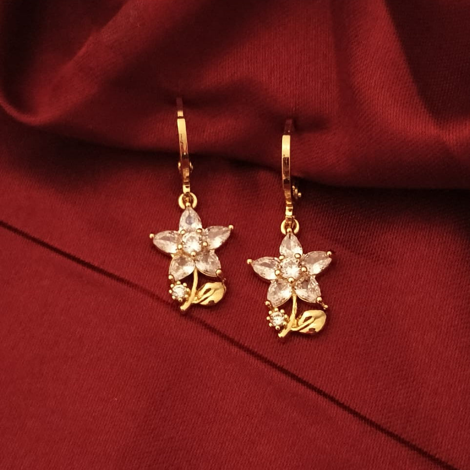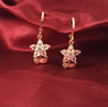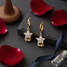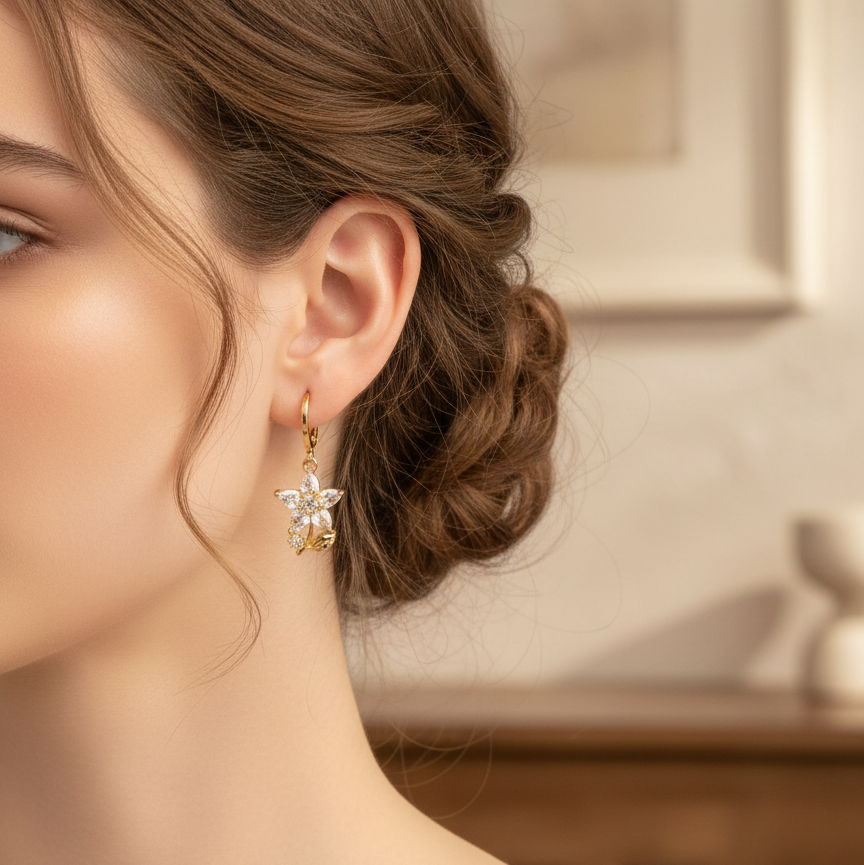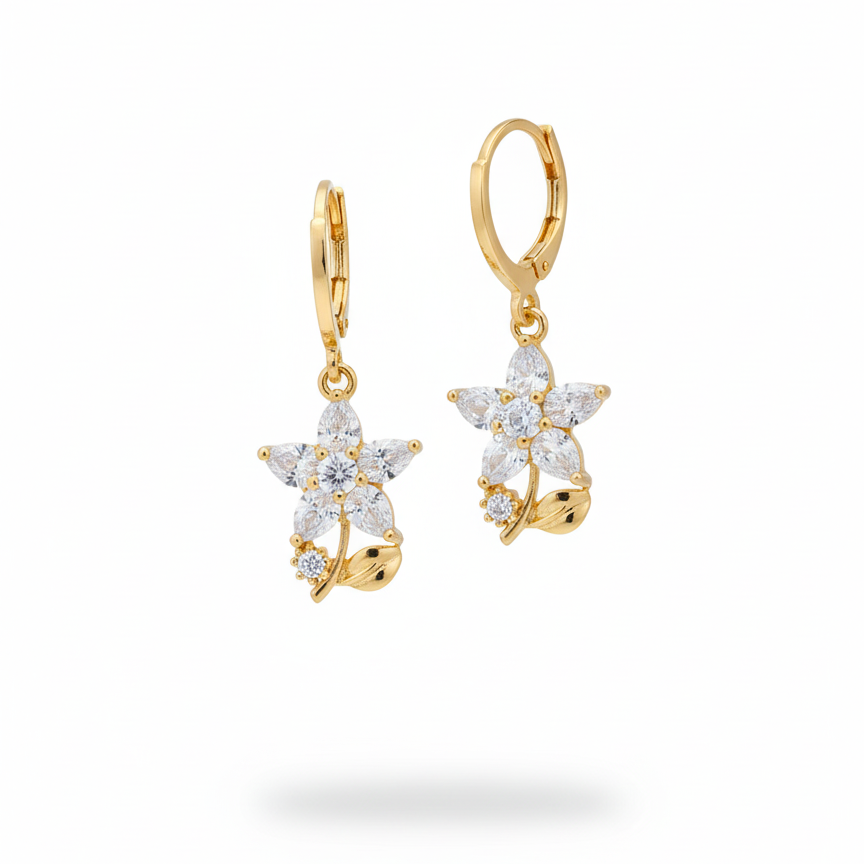 Featuring a delicate five-petal blossom set with shimmering, high-clarity crystals and accented by a sculpted golden leaf, these earrings blend classic elegance with a touch of nature-inspired whimsy.