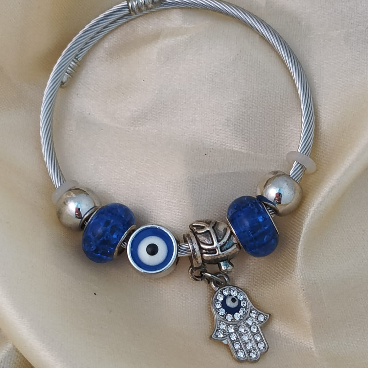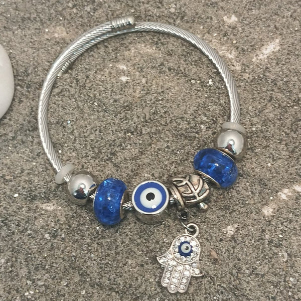 Embrace ancient protection and contemporary style with this striking Evil Eye & Hamsa Protection Charm Bangle.