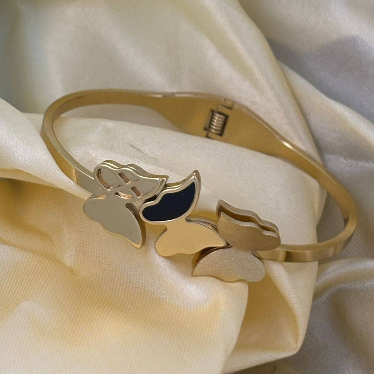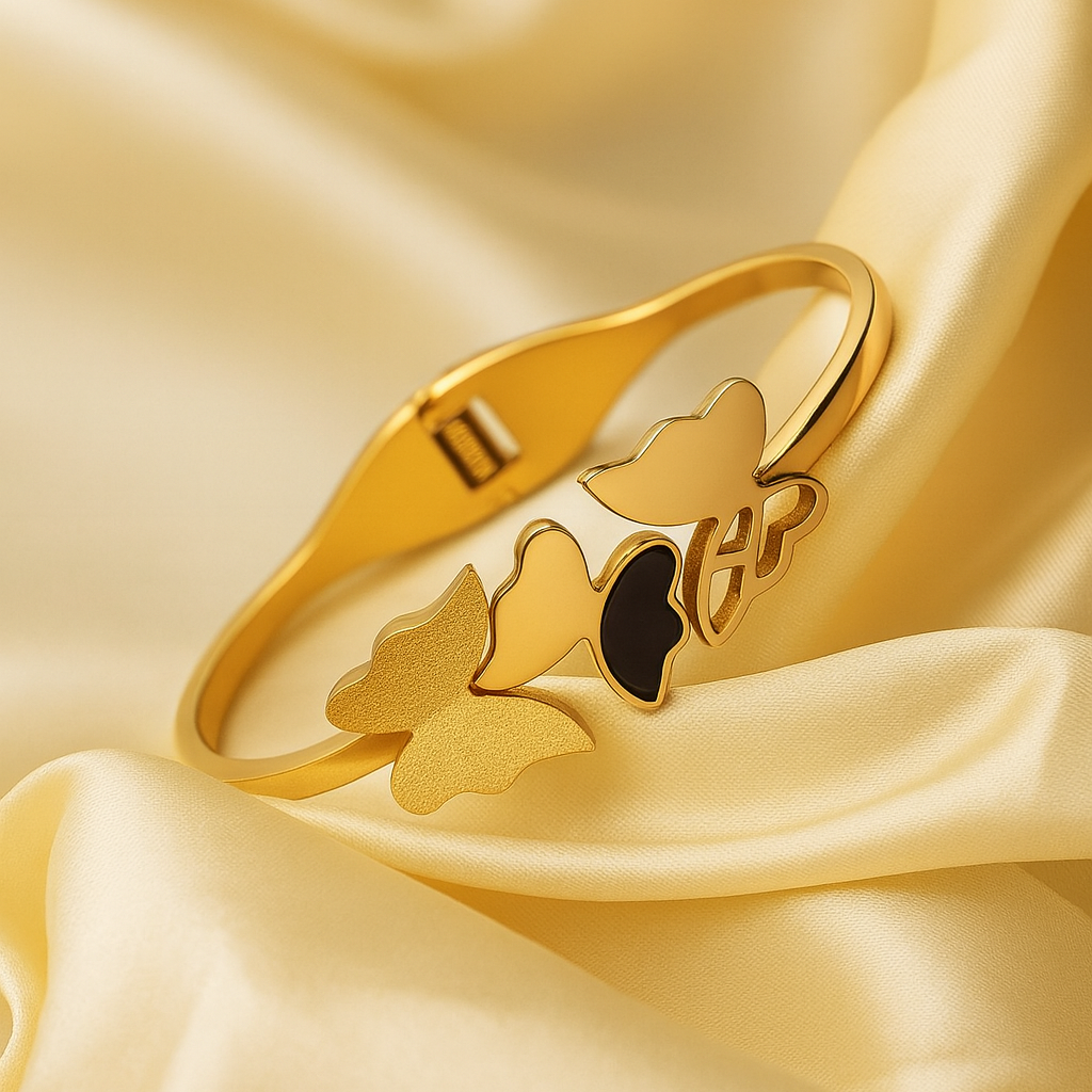 Delicate, dreamy, and effortlessly elegant — this Flutter Charm Bracelet features a trio of beautifully crafted butterfly motifs, symbolizing freedom, grace, and new beginnings. The smooth golden finish paired with a soft satin backdrop makes this piece a standout accessory for anyone who loves subtle luxury.