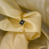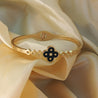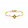 The focal point is a quatrefoil charm (a four-lobed, clover-like design) set in the center of the band. This charm has a dark blue or black enameled inlay with small gold dots or details at the center of each lobe, providing a striking contrast to the surrounding gold metal.