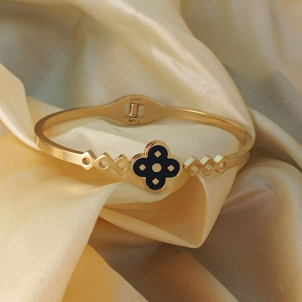 Design: It is a rigid, circular bangle with a hinged clasp mechanism for easy opening and secure fastening, visible at the top center of the bracelet.