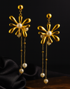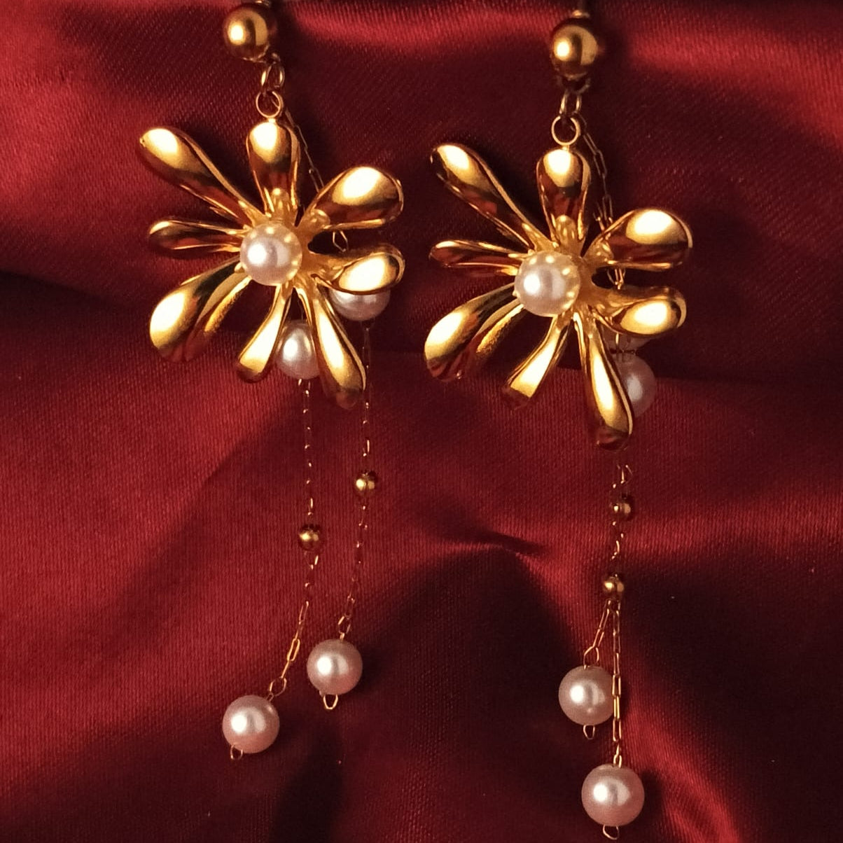 These elegant earrings feature a radiant floral design crafted in glossy gold tones, centered with luminous pearls. Delicate chain drops adorned with pearl accents add graceful movement, making them perfect for elevating both everyday style and special occasion looks.