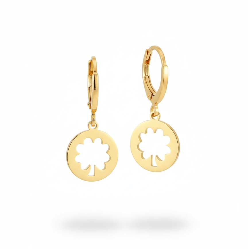 Elevate your everyday look with these stunning 18k gold-plated earrings, featuring a delicate clover cutout design suspended from a classic hoop.