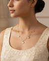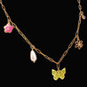 Delicate and playful, this gold-toned chain necklace features a charming green butterfly pendant paired with mini floral motifs and a drop pearl accent. It’s a refreshing piece that adds a hint of whimsy and color to your everyday look.