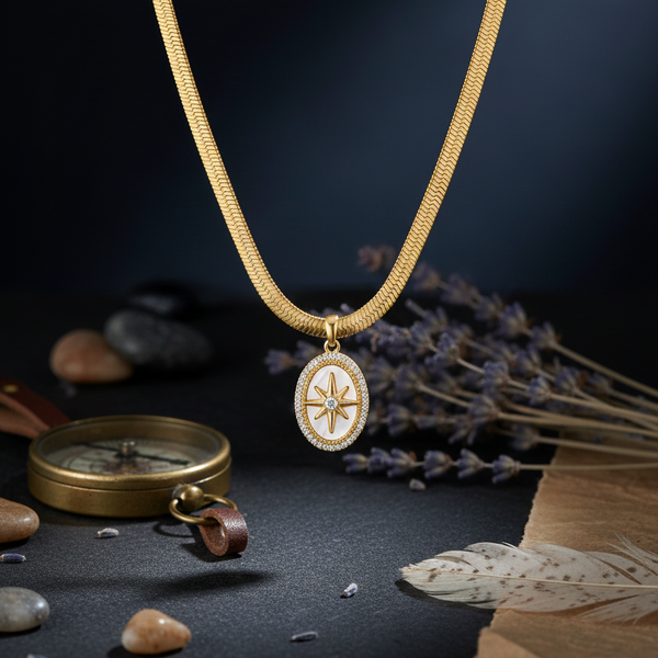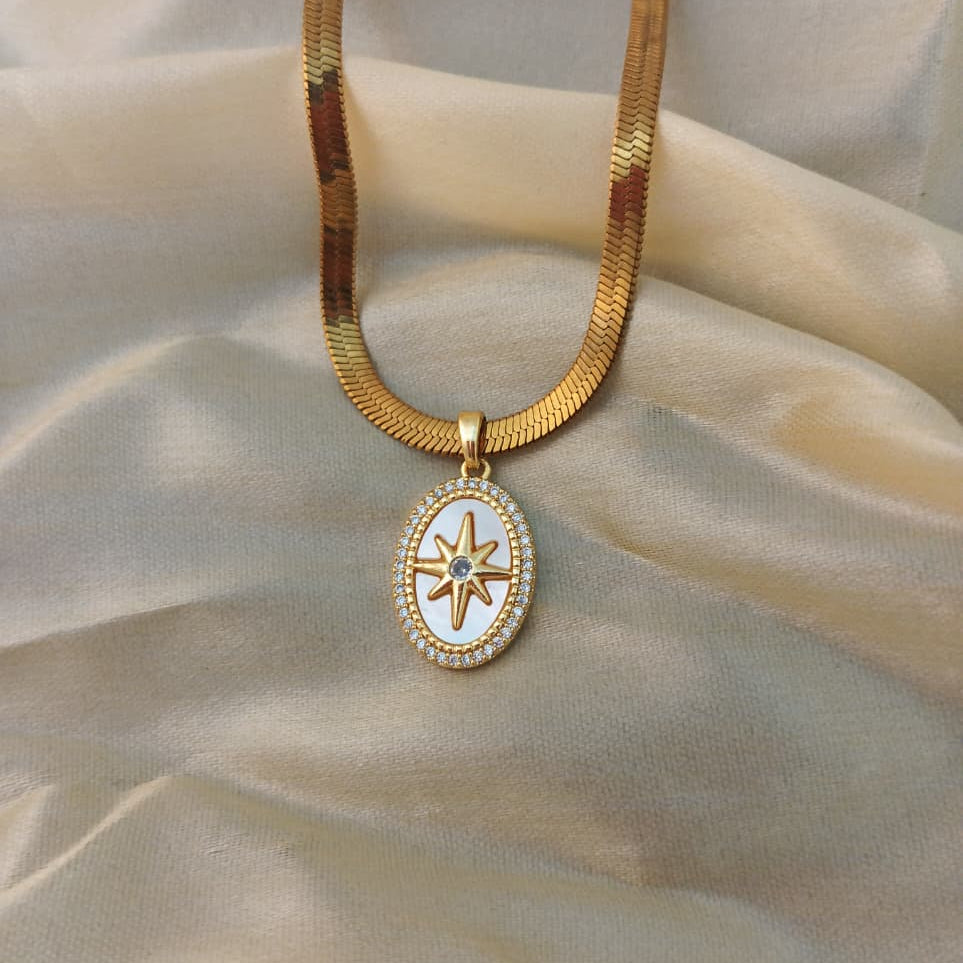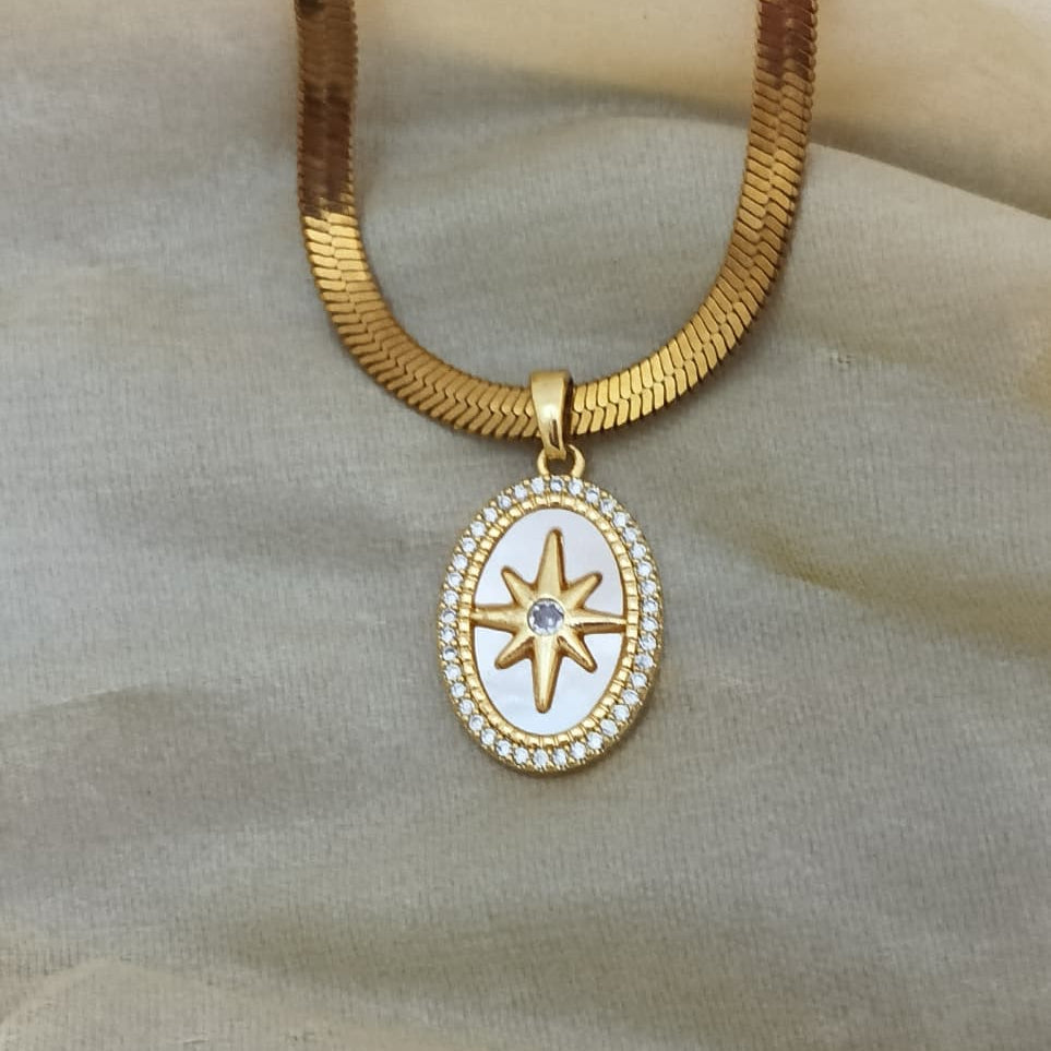 Add timeless elegance to your look with this gold-plated oval pendant necklace, featuring a dazzling north star design studded with sparkling American diamonds. Crafted in stainless steel with 18K gold plating, its anti-tarnish, waterproof, and skin-friendly — perfect for everyday wear or festive occasions.