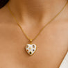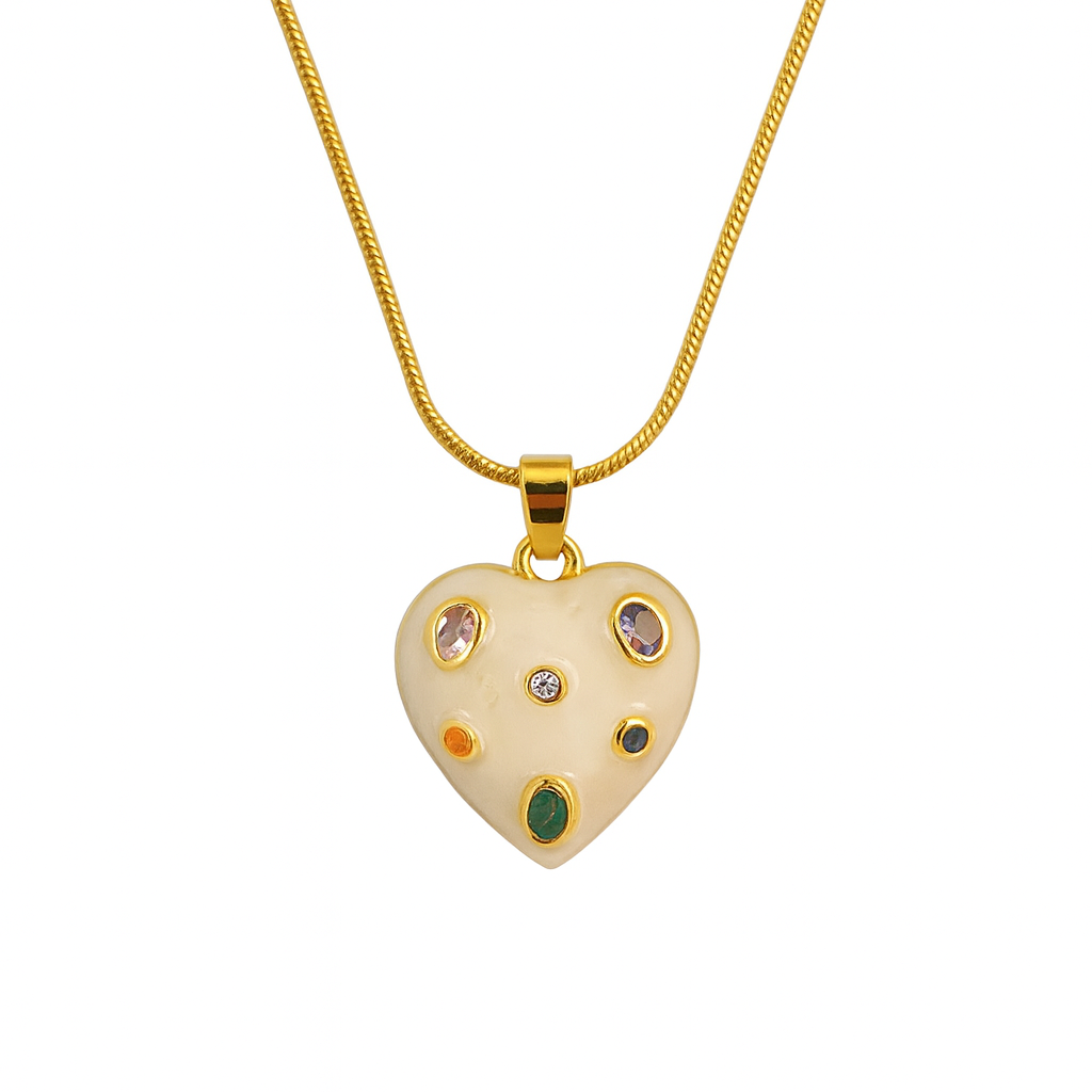 A masterpiece of charm and color, this Gold and Enamel Heart Pendant is a true statement piece. The pendant features a smooth, domed white enamel heart, giving it a luxurious, glossy finish. It is artfully studded with an array of multi-colored gemstones—including green, orange, purple, and classic white—scattered like an artist's palette. Suspended from a sleek gold snake chain, this necklace combines a classic symbol of love with a playful, contemporary design, making it an exquisite accessory that beautifully merges elegance with whimsy.