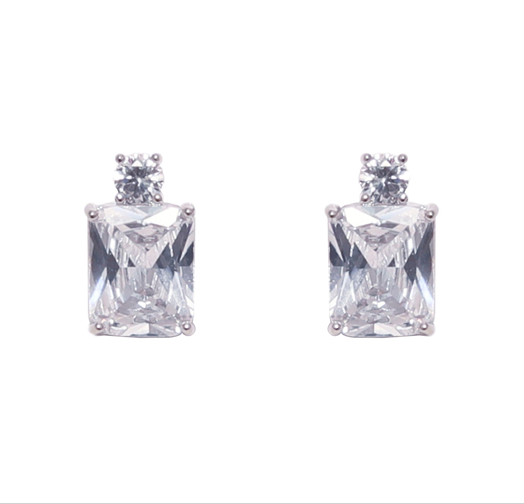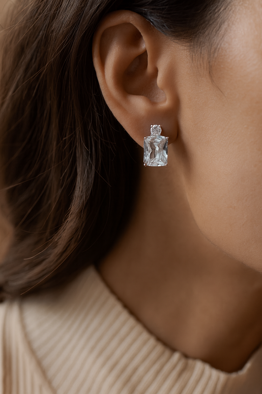 These timeless rectangular stud earrings feature a dazzling emerald-cut crystal topped with a petite round stone, creating a refined two-tier sparkle. Set in a sleek silver-toned frame, they capture light beautifully from every angle — perfect for adding subtle glamour to both day and evening looks.