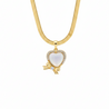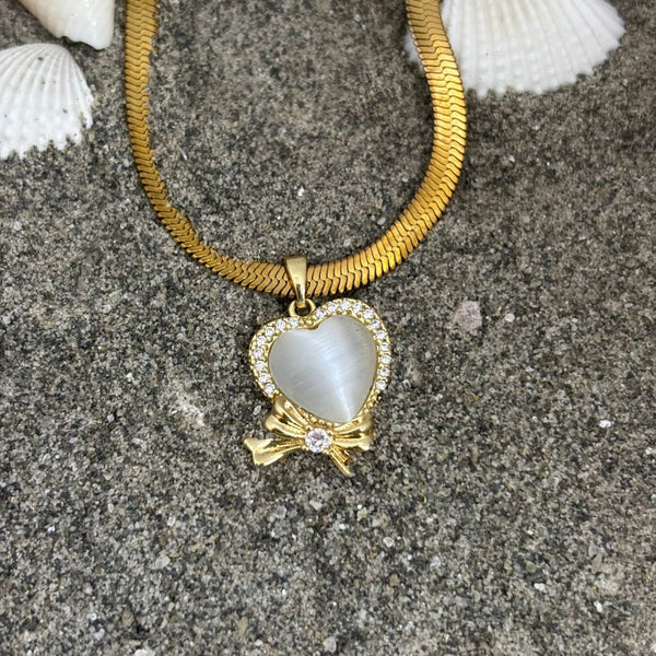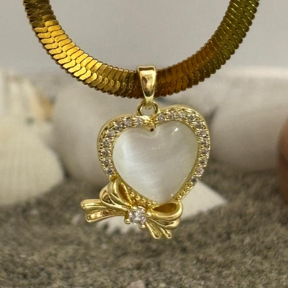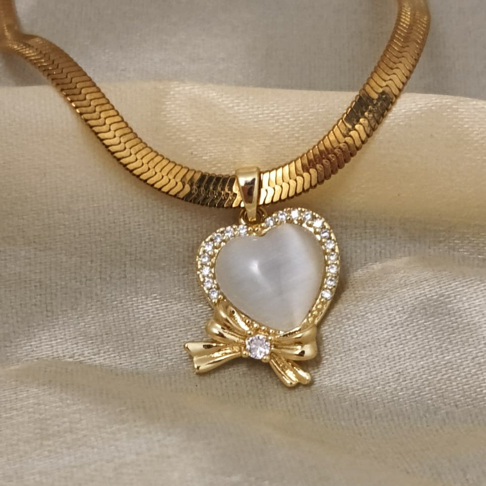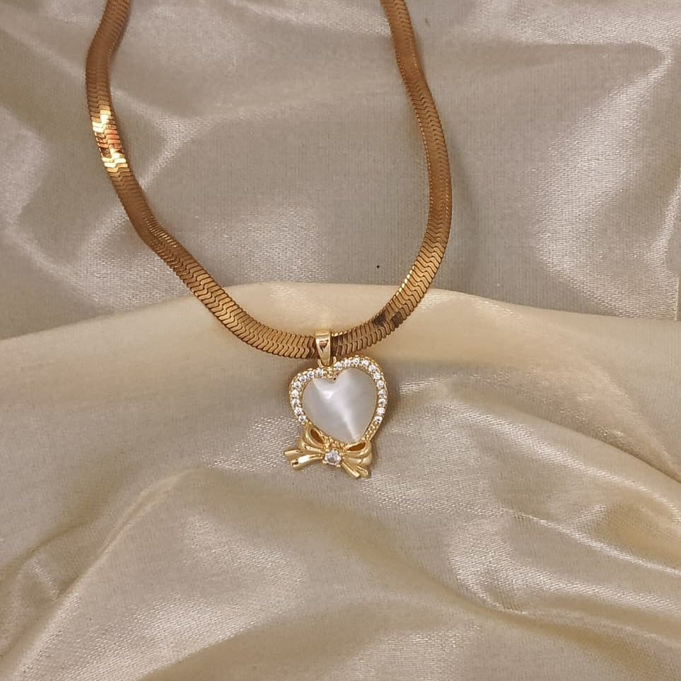 This stunning necklace features a heart-shaped pendant, meticulously crafted and adorned with sparkling accents, suspended from a beautiful golden chain. A delicate bow detail adds a touch of charm and sophistication, making it a perfect accessory for any occasion.