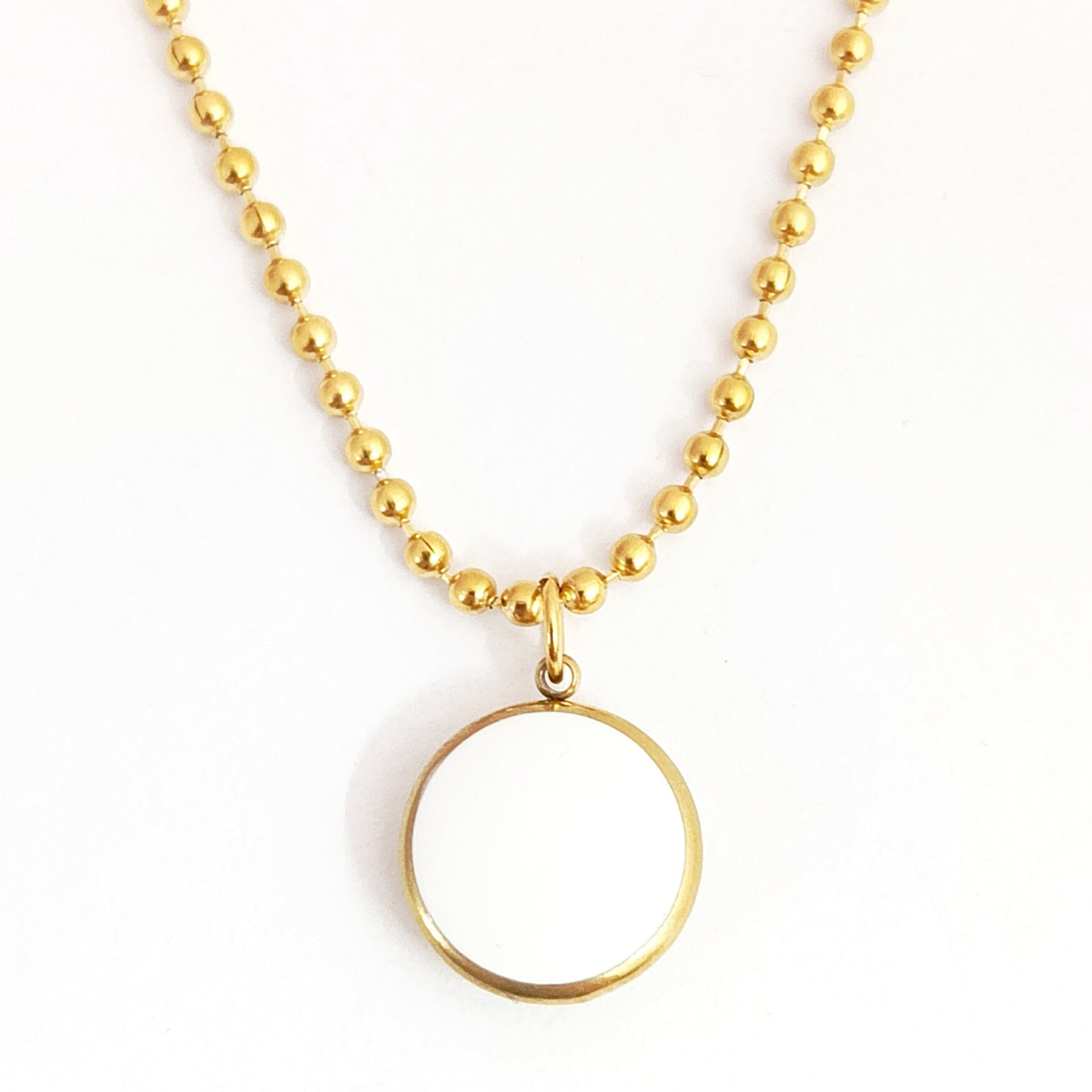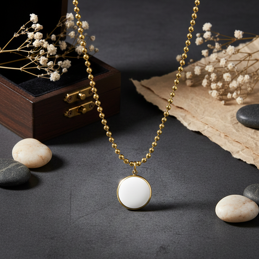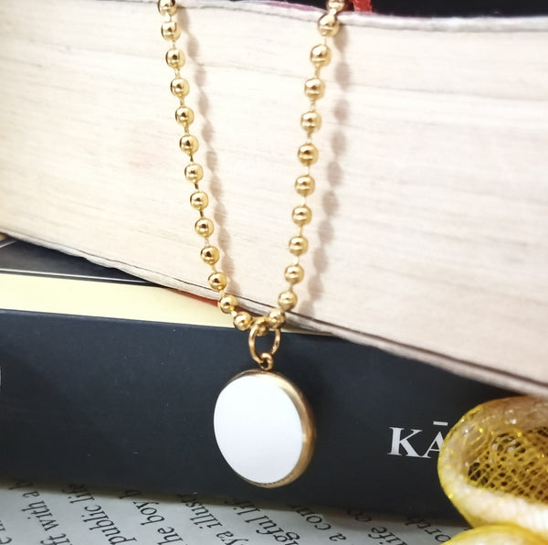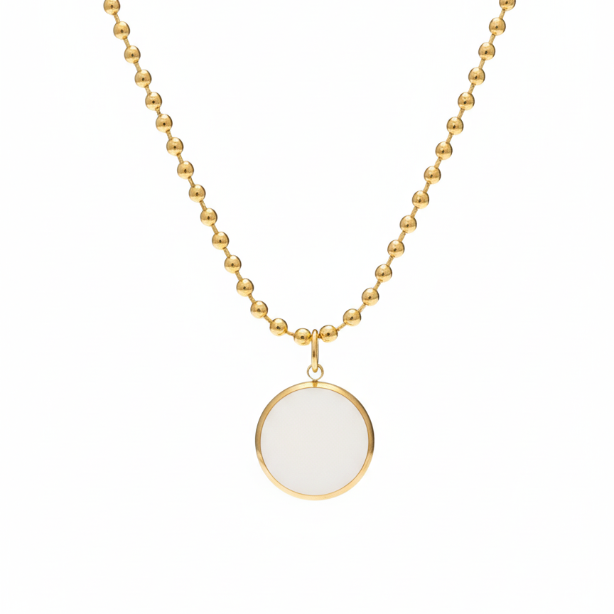 Minimalist and elegant, this round white enamel pendant on a beaded 18K gold-plated chain adds a touch of sophistication to any outfit. Crafted from high-quality stainless steel, it’s waterproof, skin-friendly, and perfect for everyday wear or layered styling.
