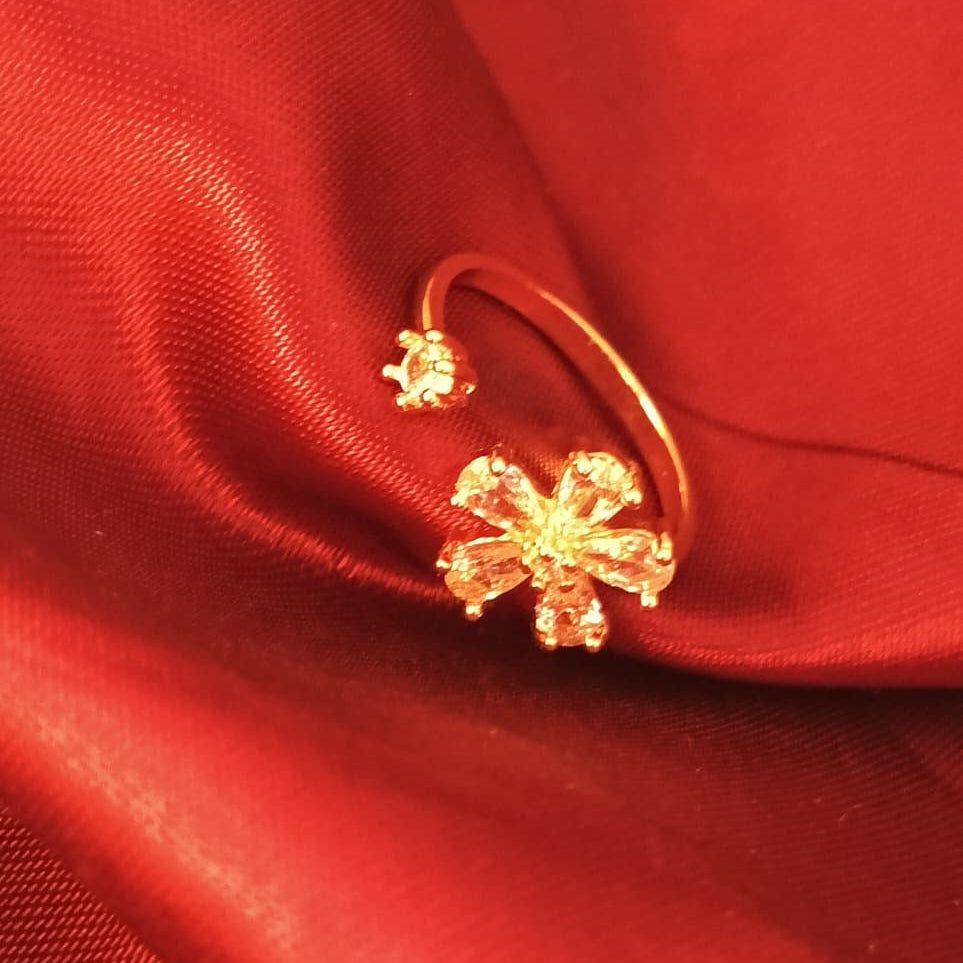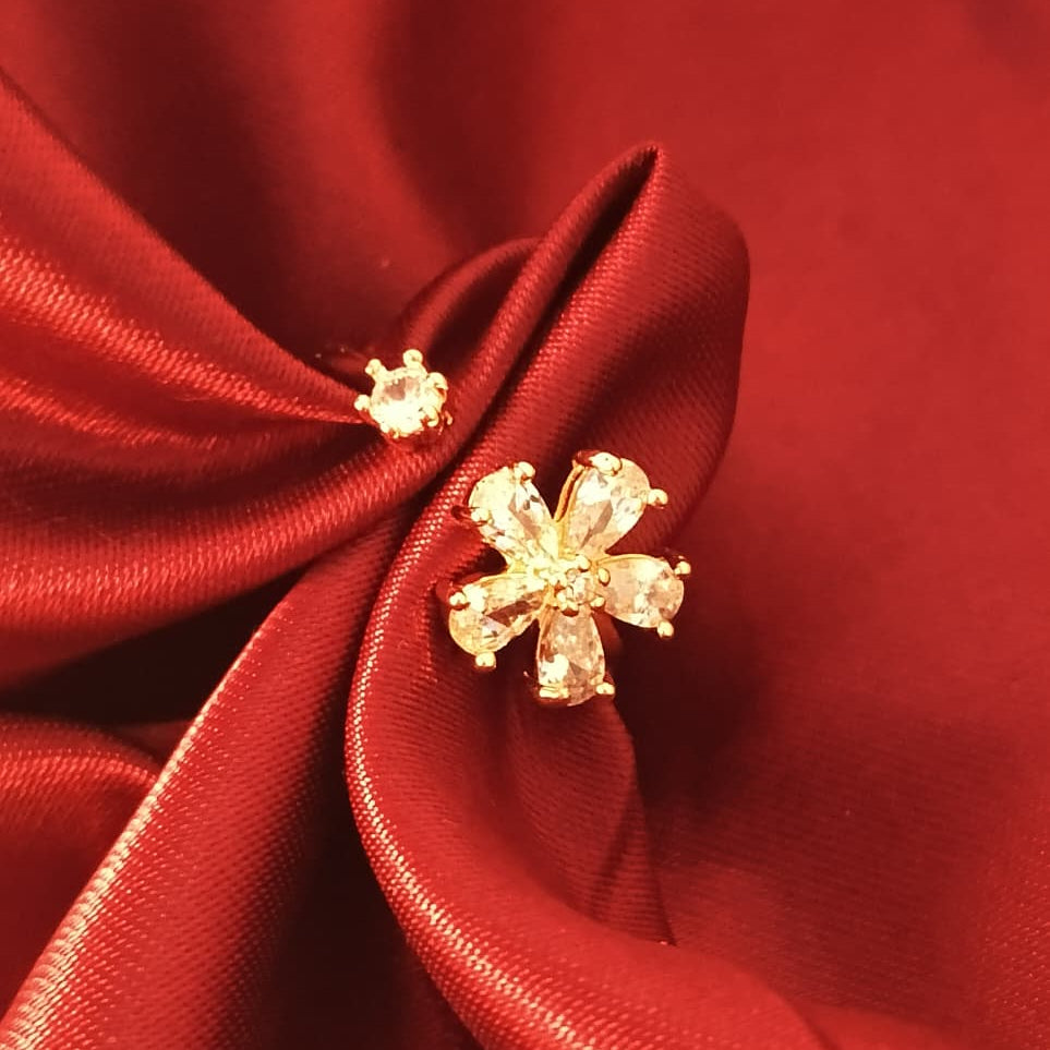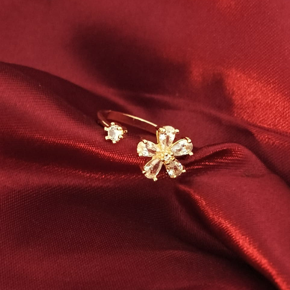 This exquisite ring features a striking flower silhouette, meticulously crafted with five pear-cut crystals that catch the light from every angle.