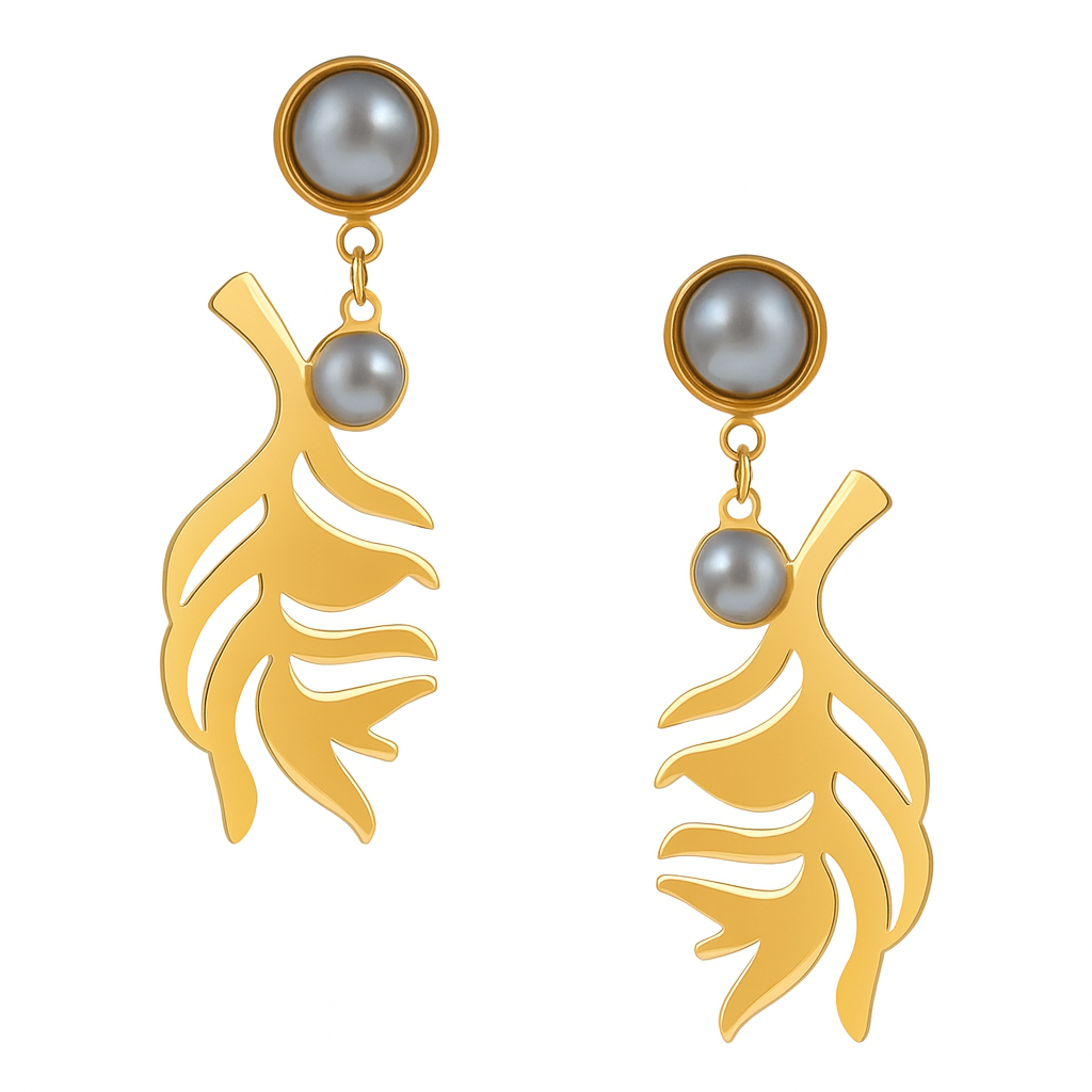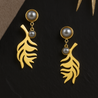 Make a subtle yet sophisticated statement. These exquisitely crafted gold-tone leaf dangle earrings, accented with lustrous grey pearls, effortlessly blend organic beauty with timeless elegance.