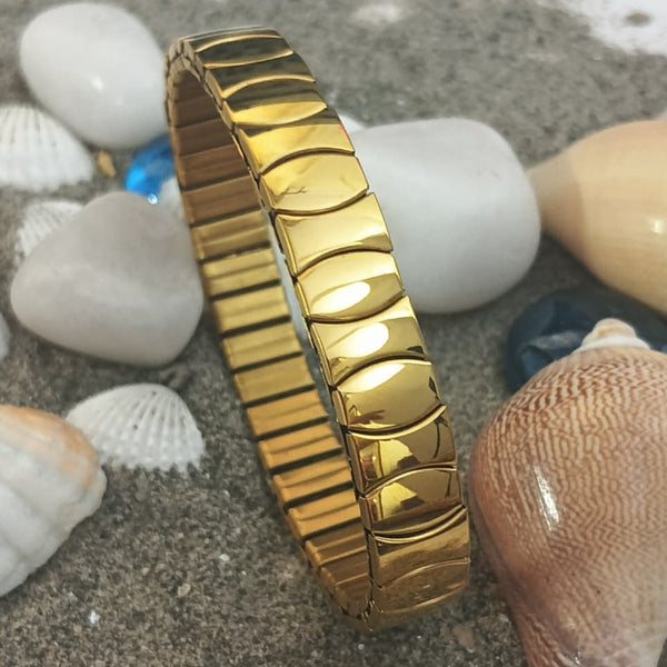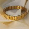 Featuring a sleek tile-linked pattern, its polished gold finish adds a luxurious shine while the flexible stretch design ensures a perfect fit for every wrist.